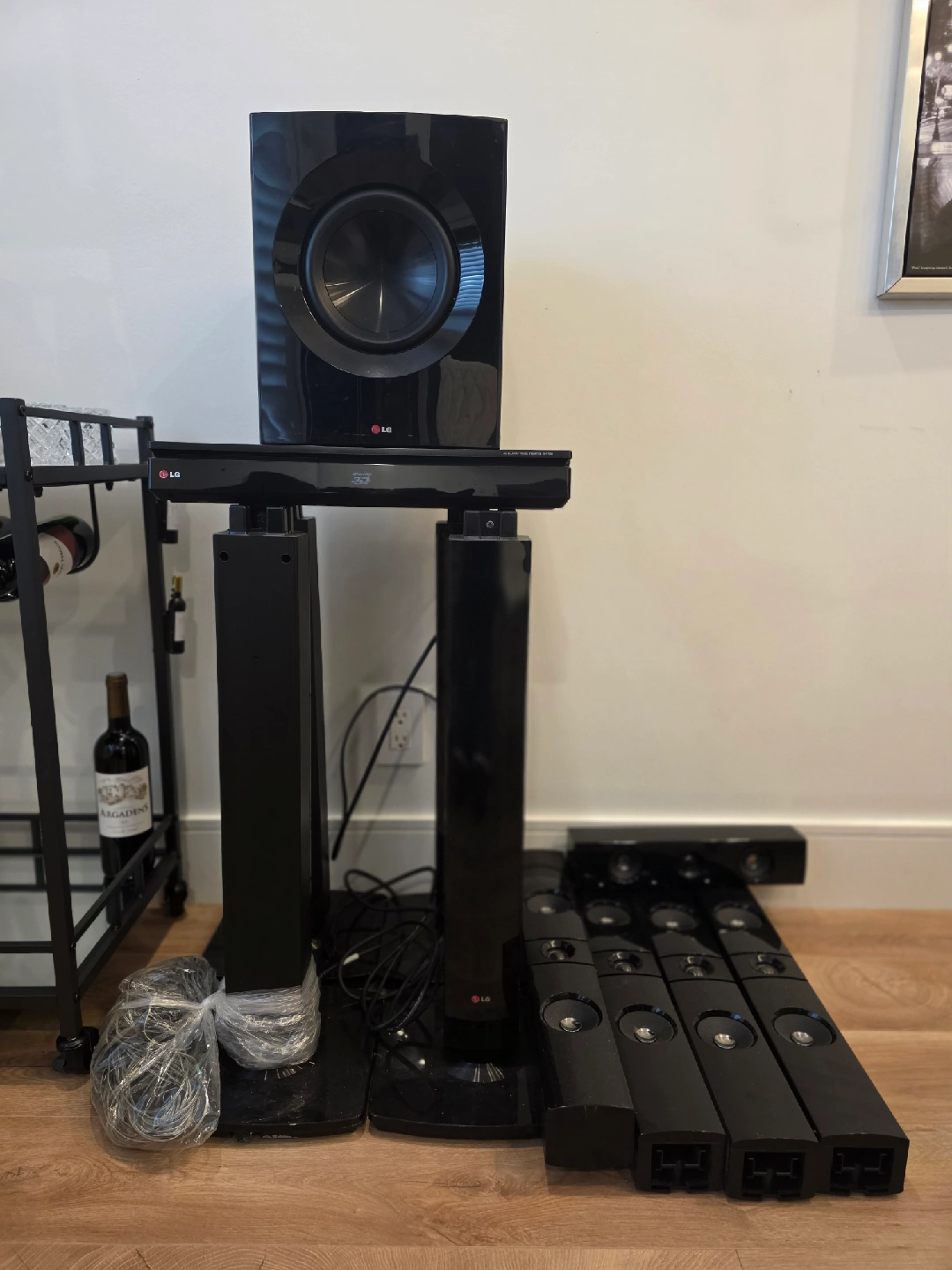 Selling an LG 3D Blu-ray Home Theater System. Comes with all the components you see in the photos, including the subwoofer, soundbar, speakers, and wiring. Great for upgrading your home entertainment setup!