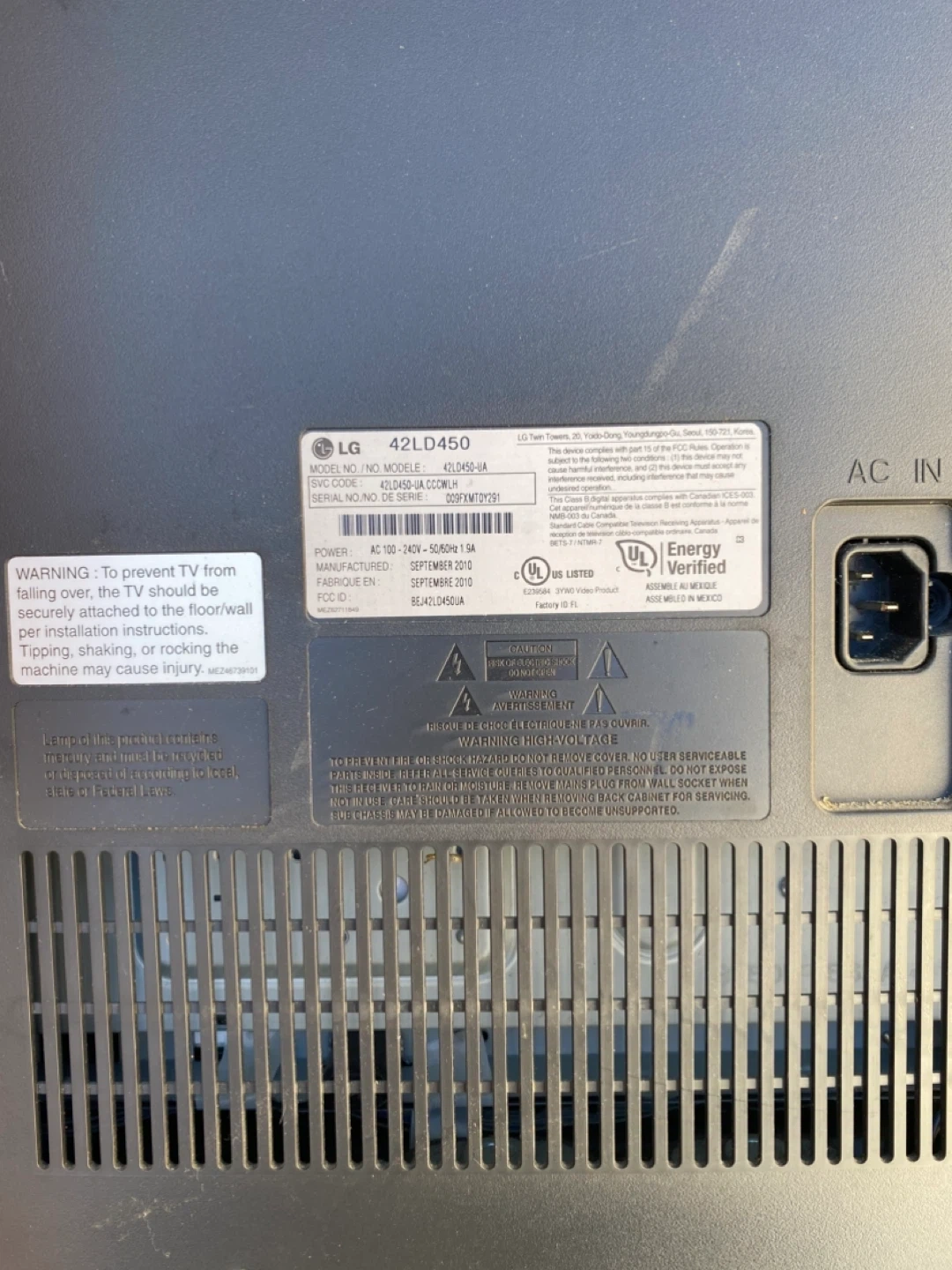 Selling an LG 42LD450 television. It's a 42-inch model. It has ports for HDMI, USB, and component video. No stand.