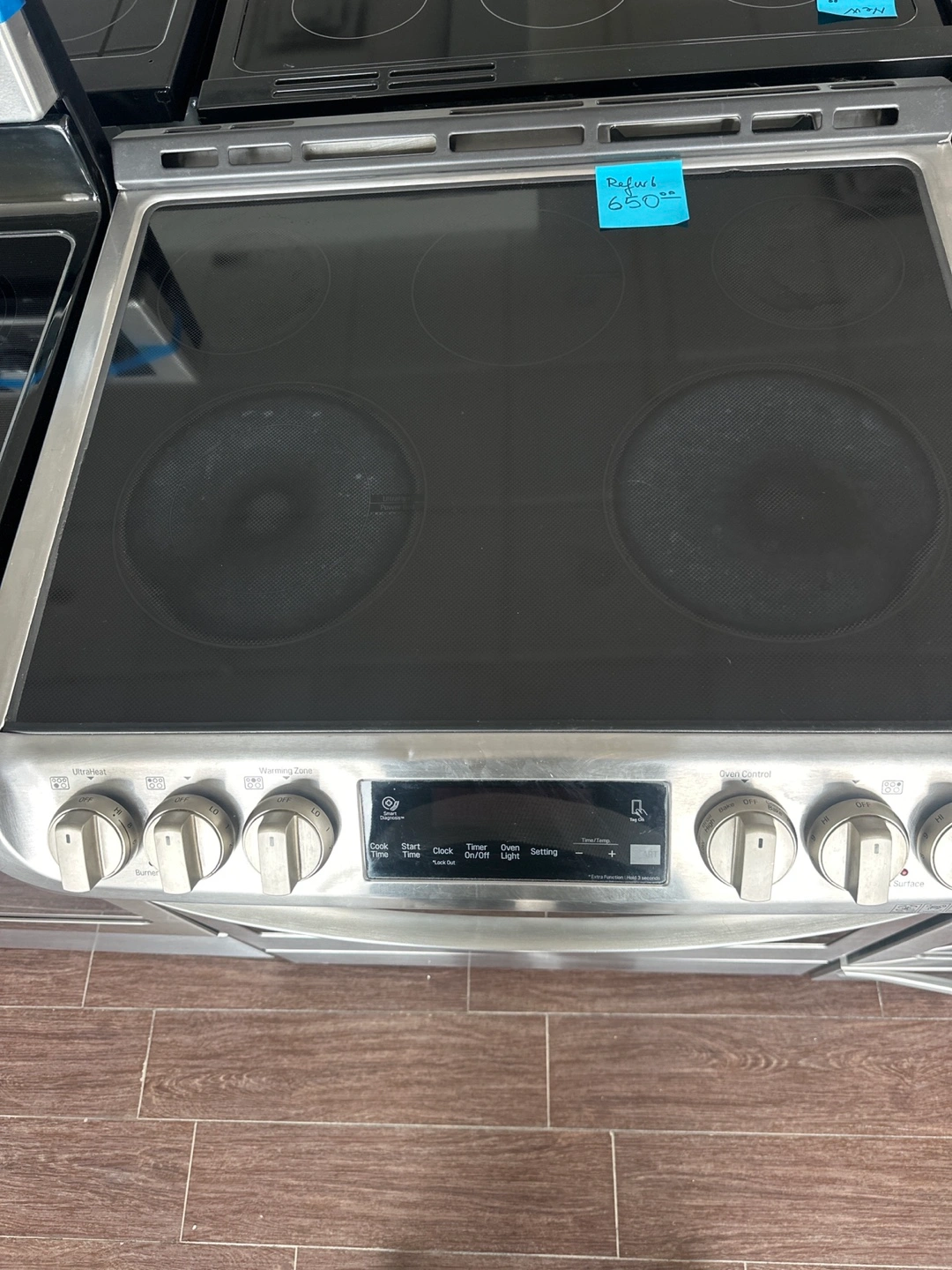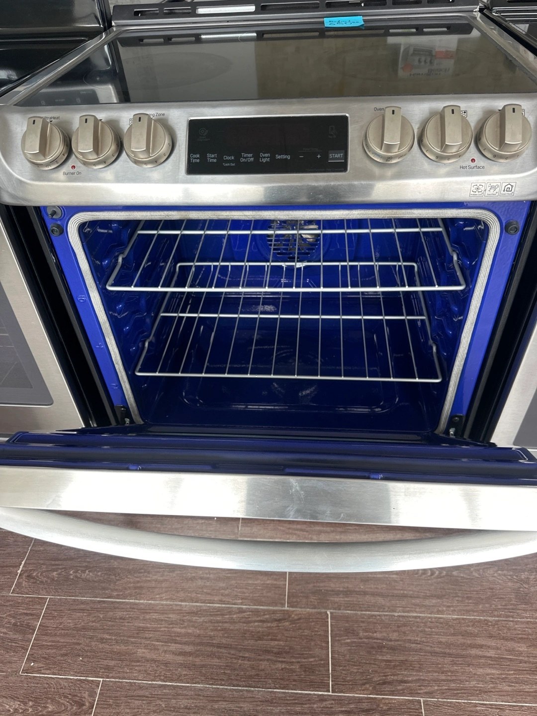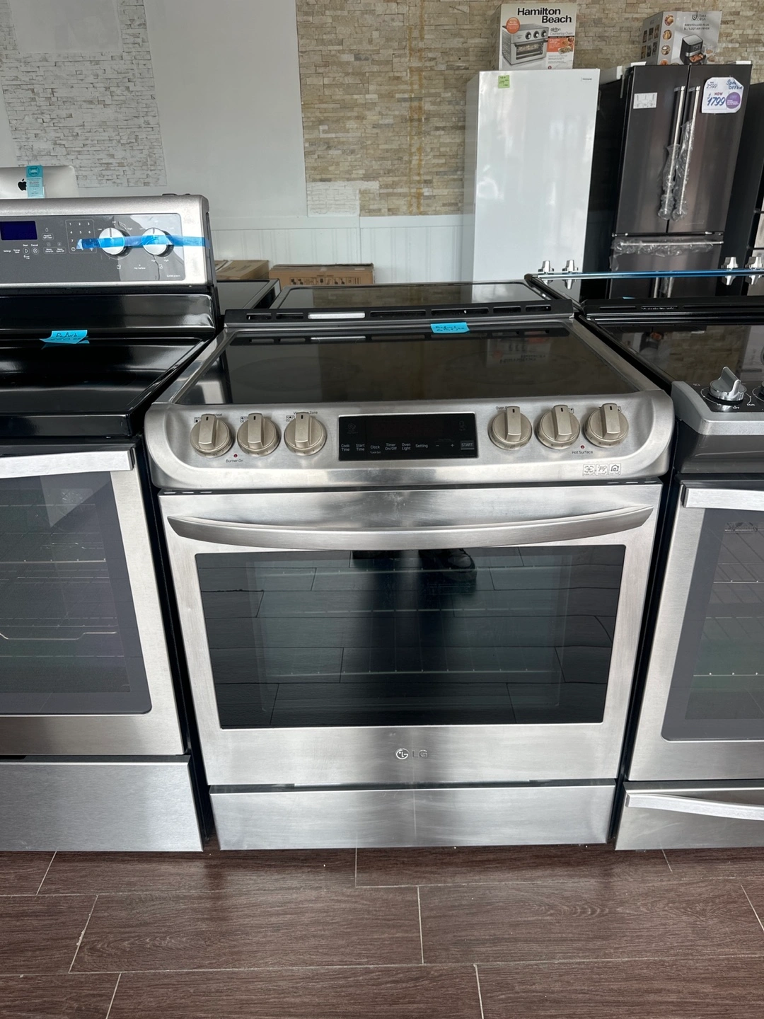 Stainless steel electric range. Cooktop with 4 burners. Oven with front door and interior shelving. A fantastic way to make yourself a cozy meal after a long day. Refurbished
