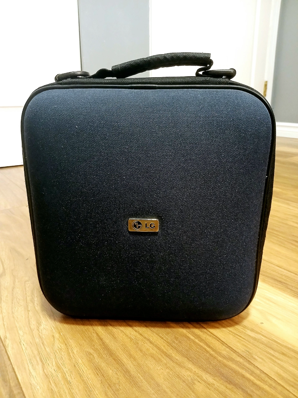 LG Hard-shell handle carrying case, blue exterior / black interior. Suitable for small electronic device's e.g - DVD / BluRay Player or DSLR Camera. Small storage pockets, great for small items - Batteries / Cables / Power Cords. (Available Now!) ๐