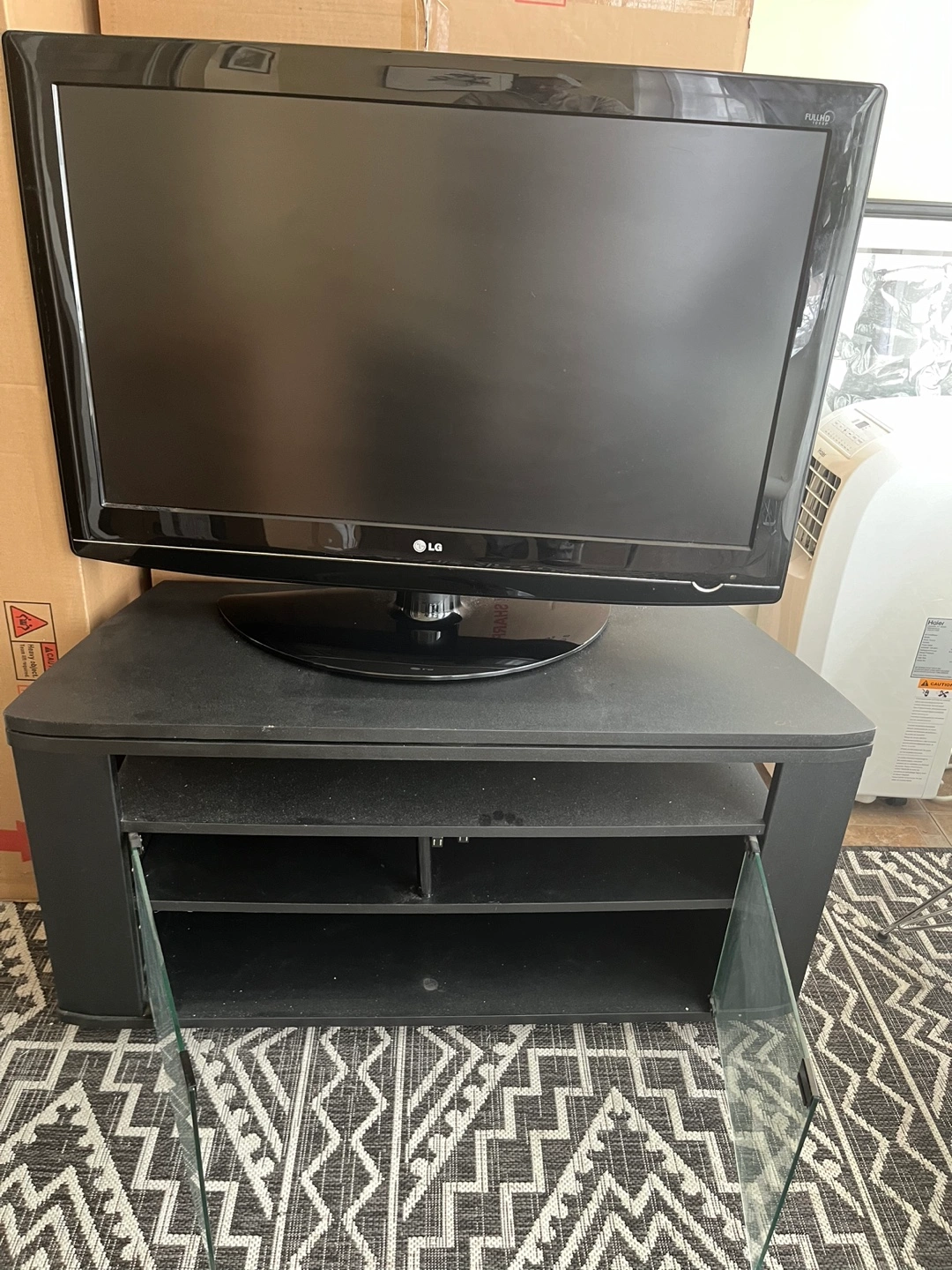 88LG flat screen TV on a black stand. Has glass doors. Great for a small space. Bothe are very very good condition not even one single scratch and you can get it together or suppurate for TV $65 TV stand $30