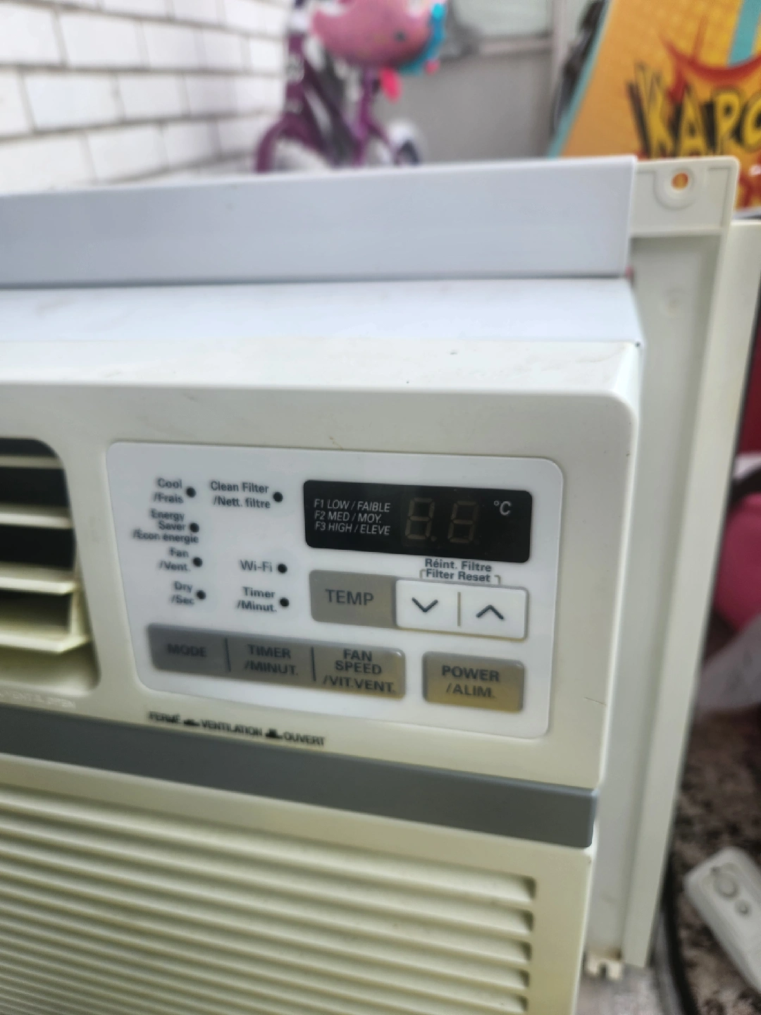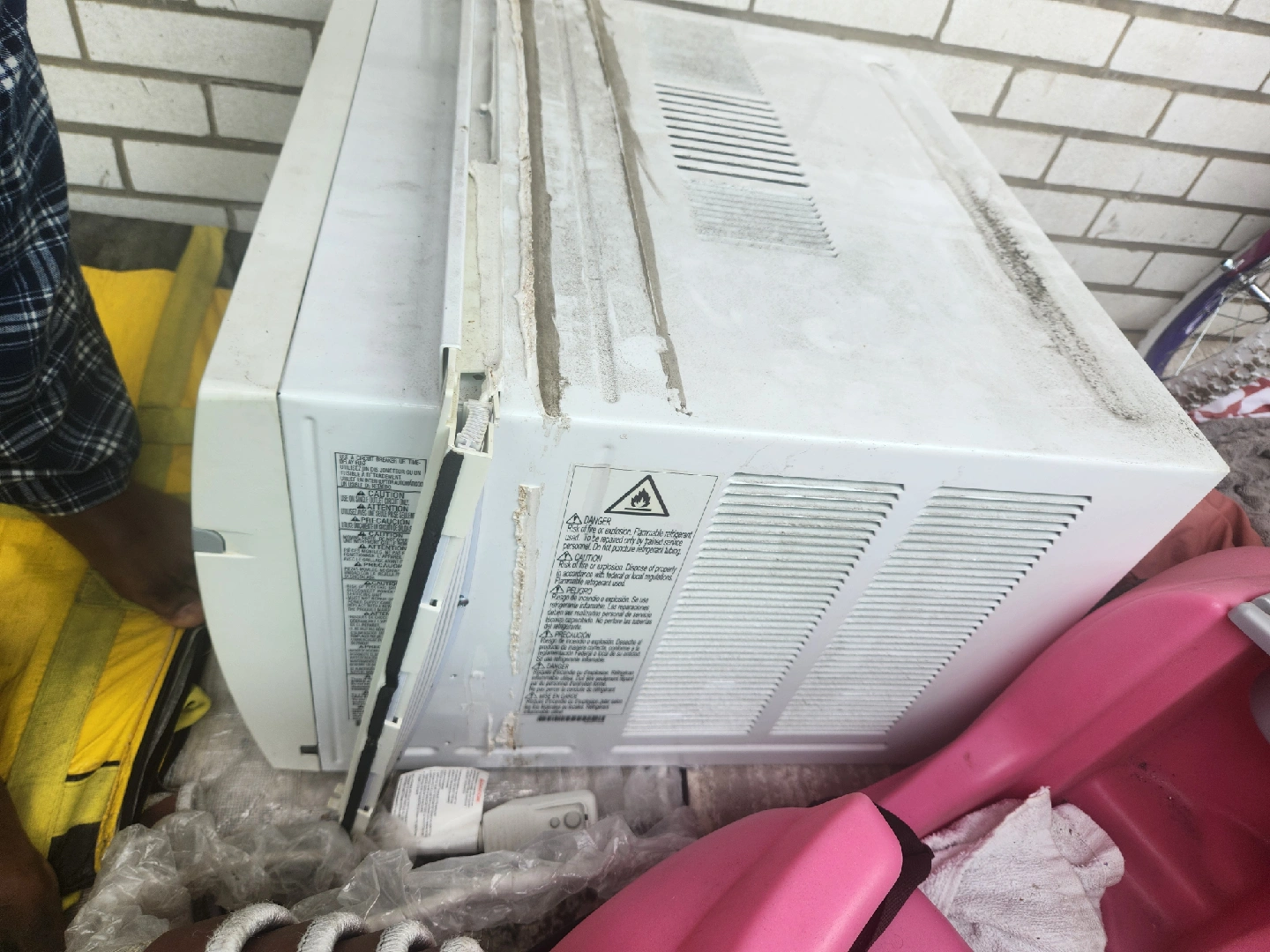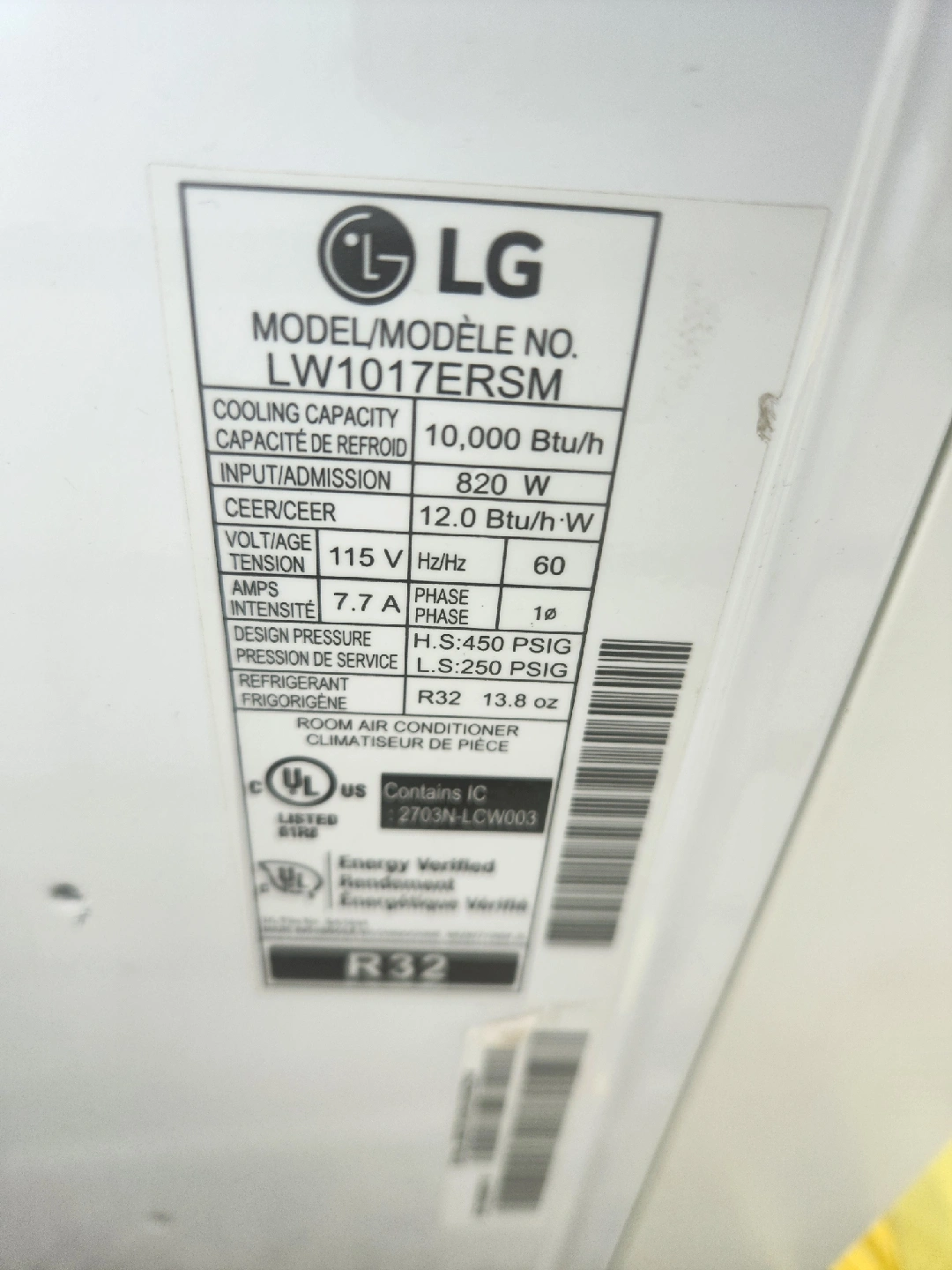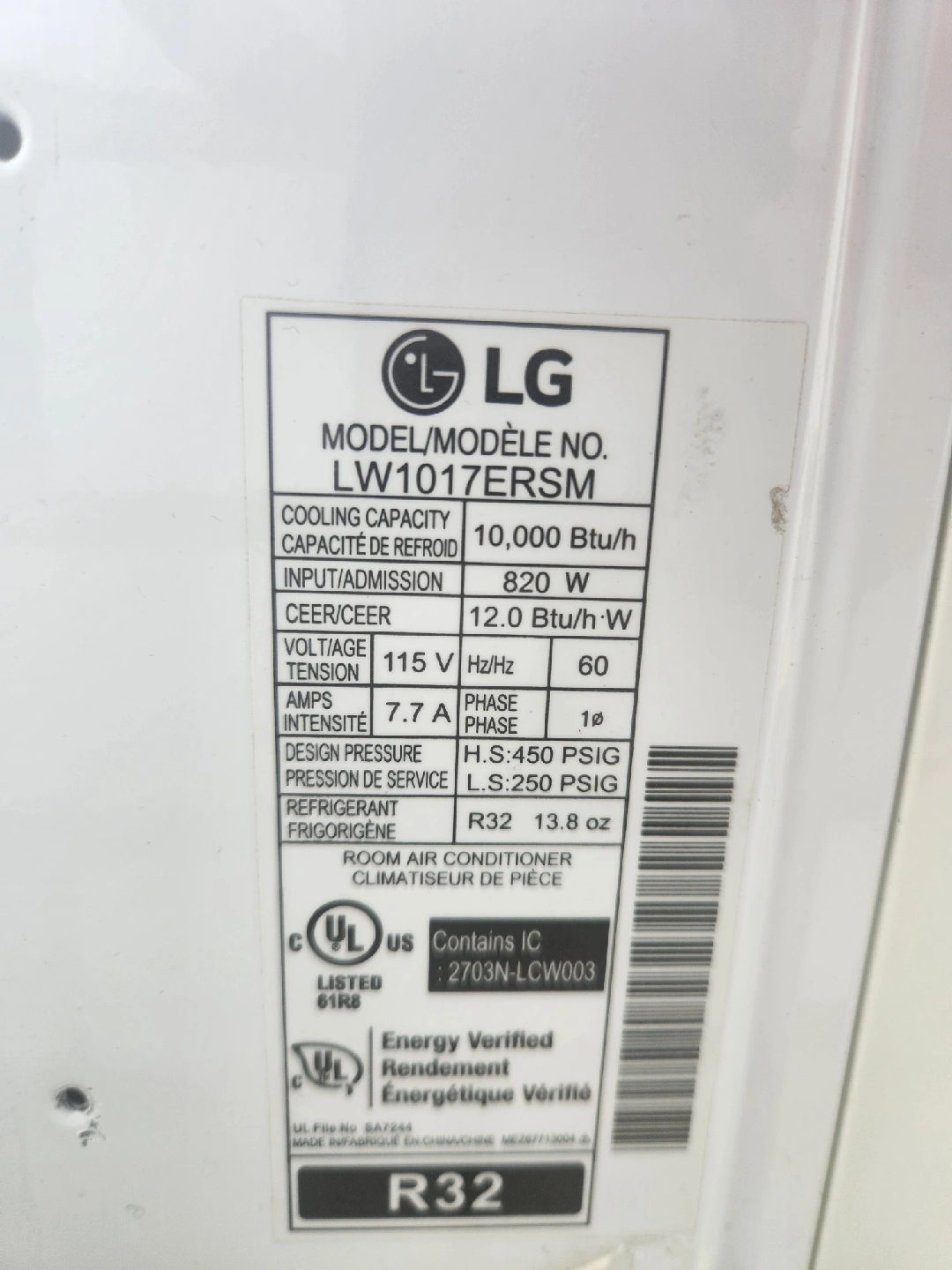 60Selling an LG room air conditioner, model LW1017ERSM. It has a cooling capacity of 10,000 BTU/h and uses 820W of power. It requires 115V and 7.7A. It uses R32 refrigerant.