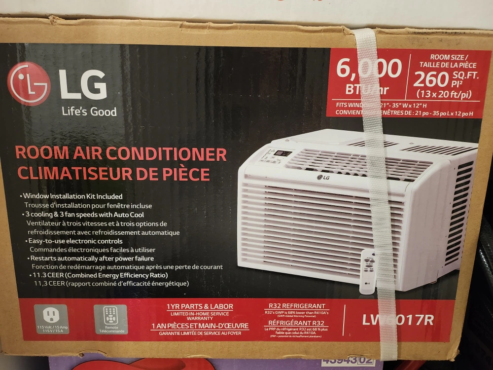 123LG window air conditioner. 6000 BTU, cools rooms up to 260 sq ft. Includes window installation kit and remote. 3 cooling and fan speeds with auto cool function. Restarts automatically after power failure. very good condition ๐ ๐ ๐