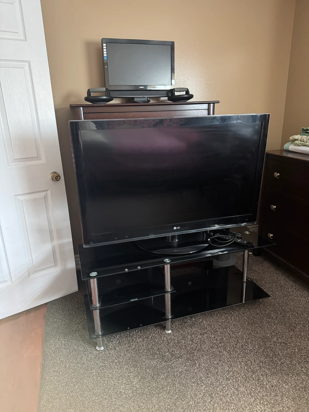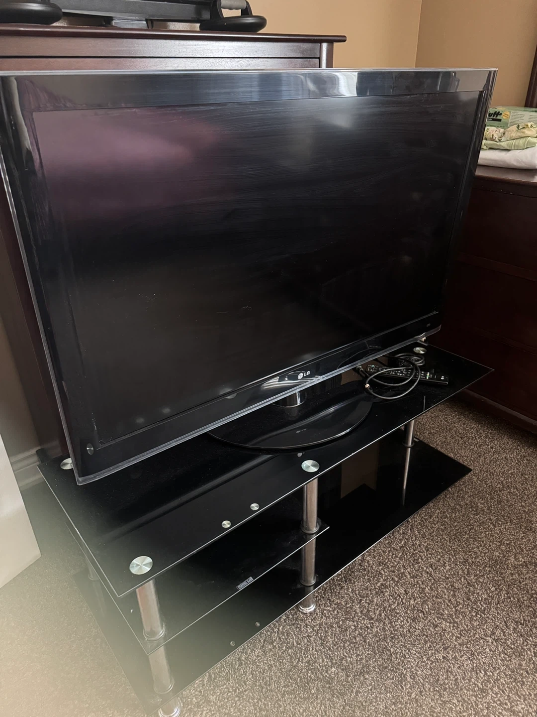 Selling an LG TV that comes with a sleek black glass stand. It's in good condition and ready for a new home! Perfect for a living room or entertainment area