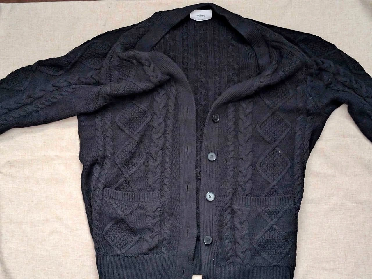 15LG black wilfred cardi, cable knit, oversized with pockets. No pulls, no damage, all the stitches look great and the extra button is still attached on the inside tag