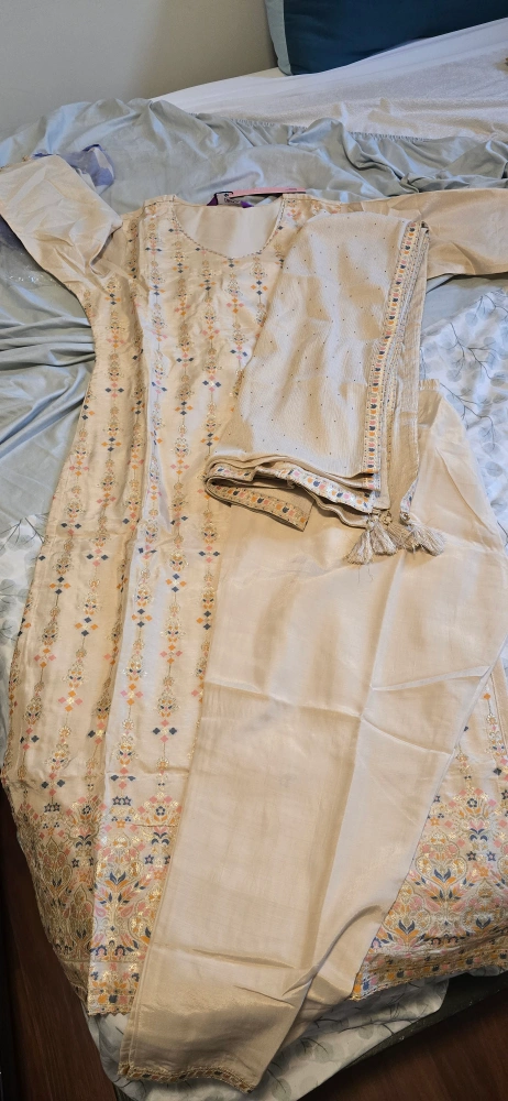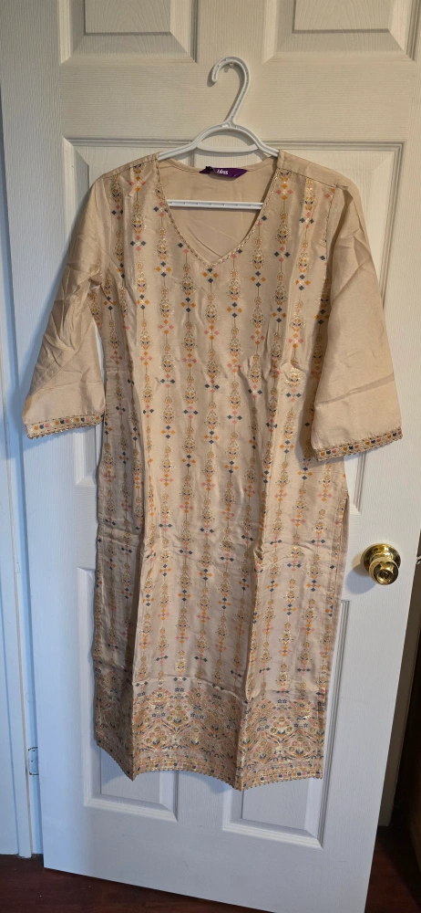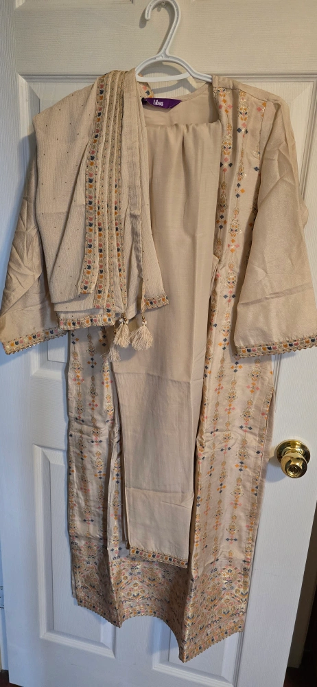 70Selling a BRAND NEW beautiful beige kurta set from Libas! The set includes a kurta, pants, and dupatta, all with lovely embroidery details. It's never been worn, but its beautiful!