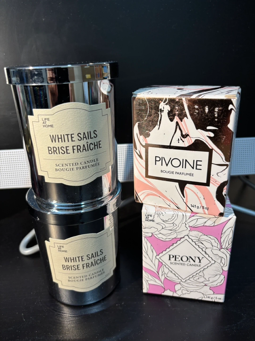 Selling four Life At Home scented candles! You'll get: - White Sails Brise Fraîche - Pivoine Bougie Parfumée (141g/5oz) - Peony Scented Candle (141g/5oz)