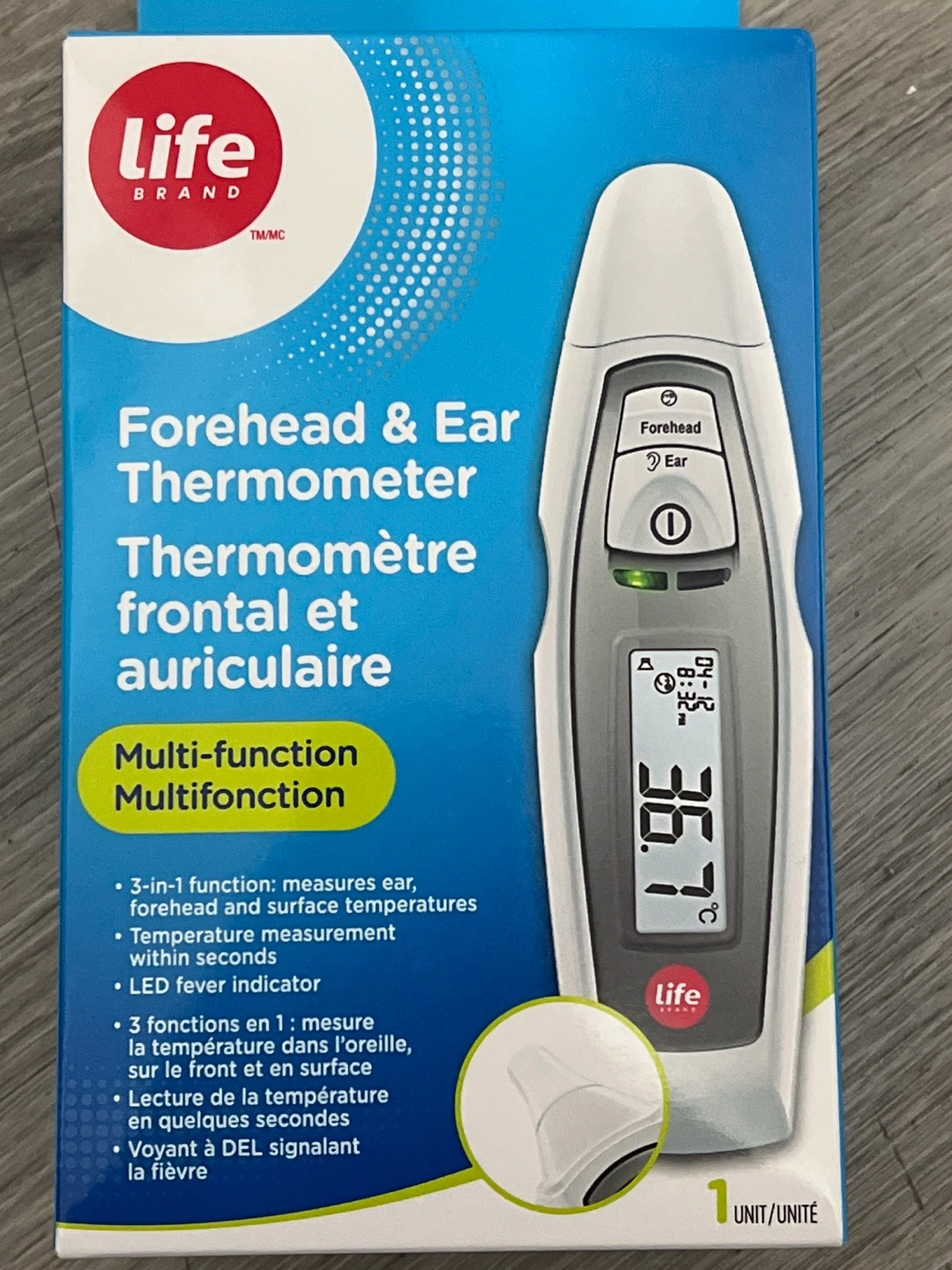 107Selling a brand new Life Brand Forehead & Ear Thermometer! This multi-function thermometer measures ear, forehead, and surface temperatures in seconds. It also has an LED fever indicator. Comes in the original box.