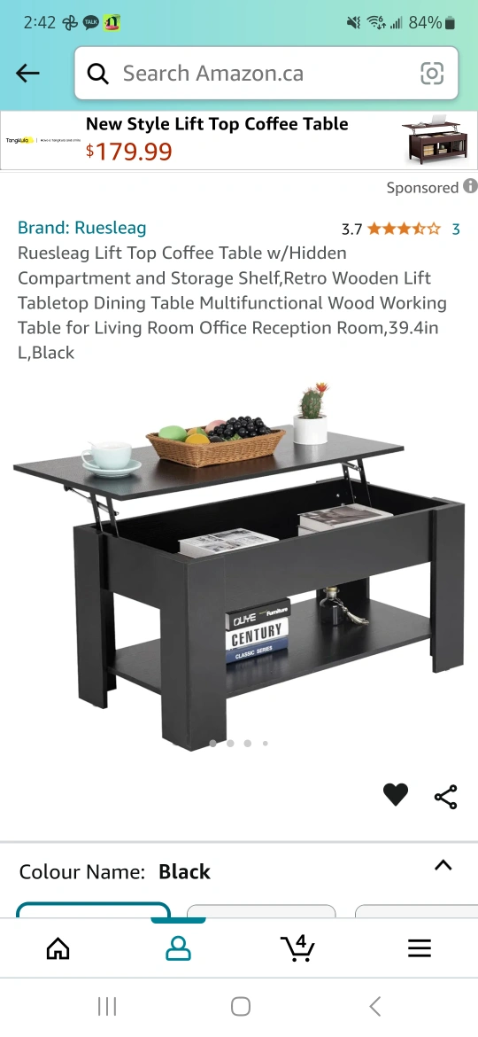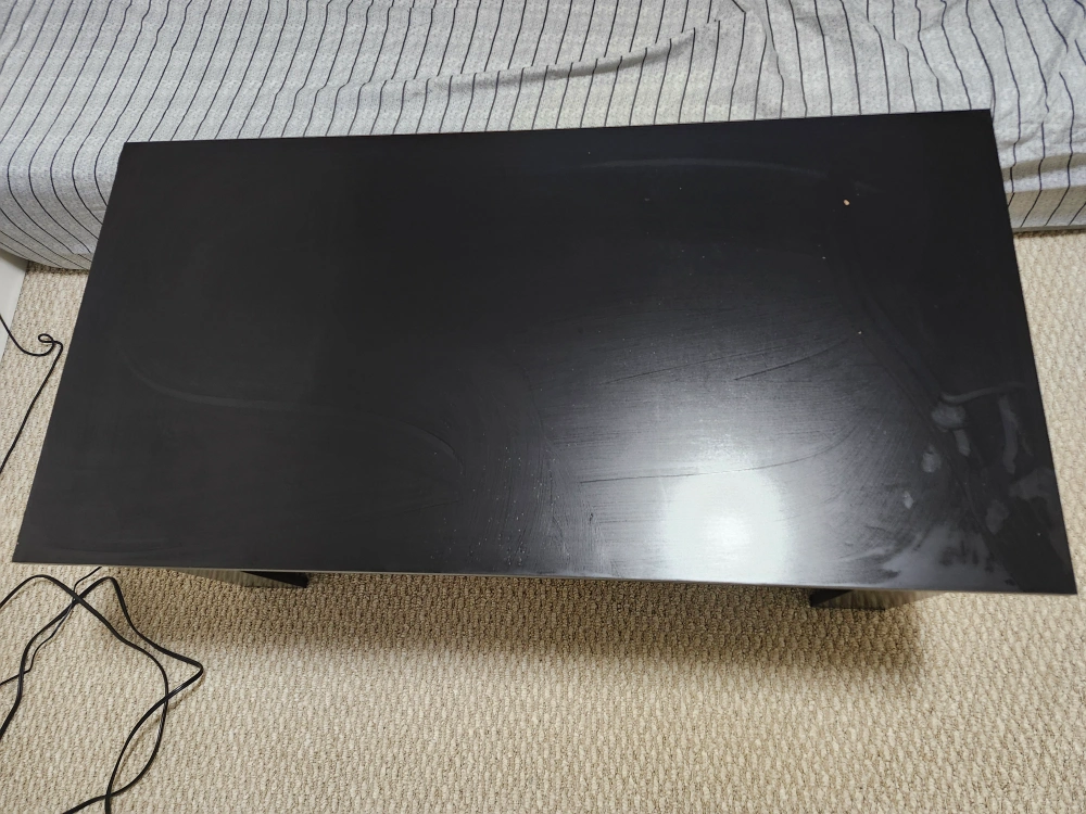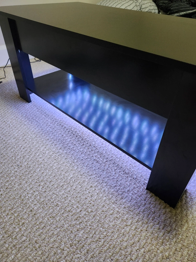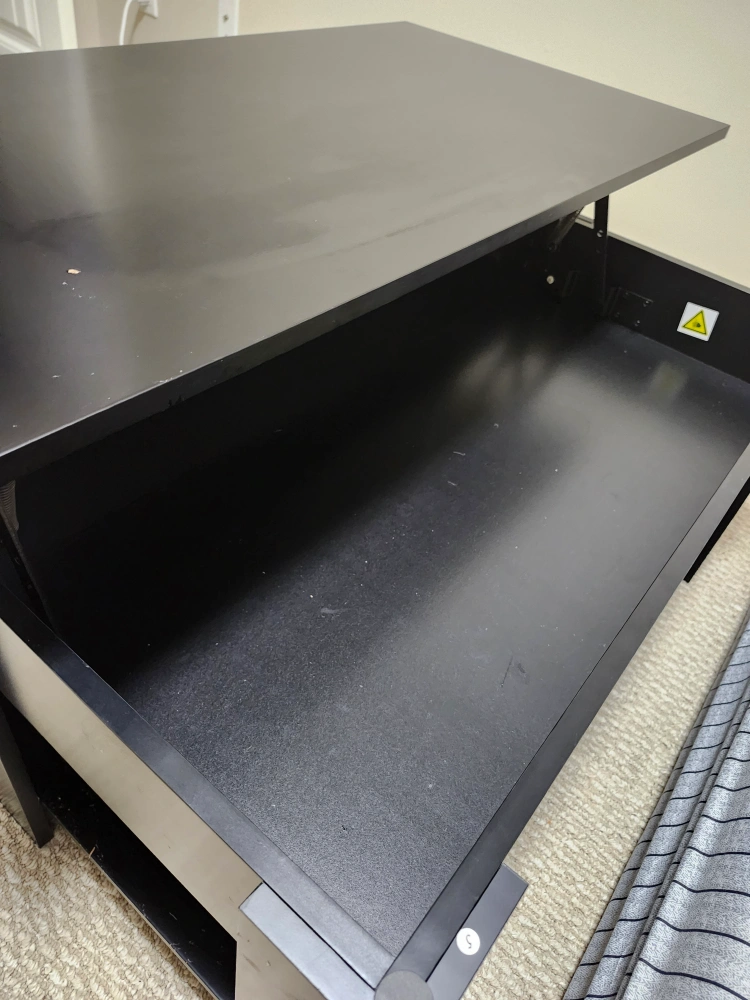 12Black lift top coffee table with storage shelf. The table has a lift top that can be raised to create a dining or working surface. The table also has a storage shelf that is great for storing books, magazines, or other items. There is a light wire attached.There is a shiny line attached to the bottom of the desk. I'll provide it with a remote control.