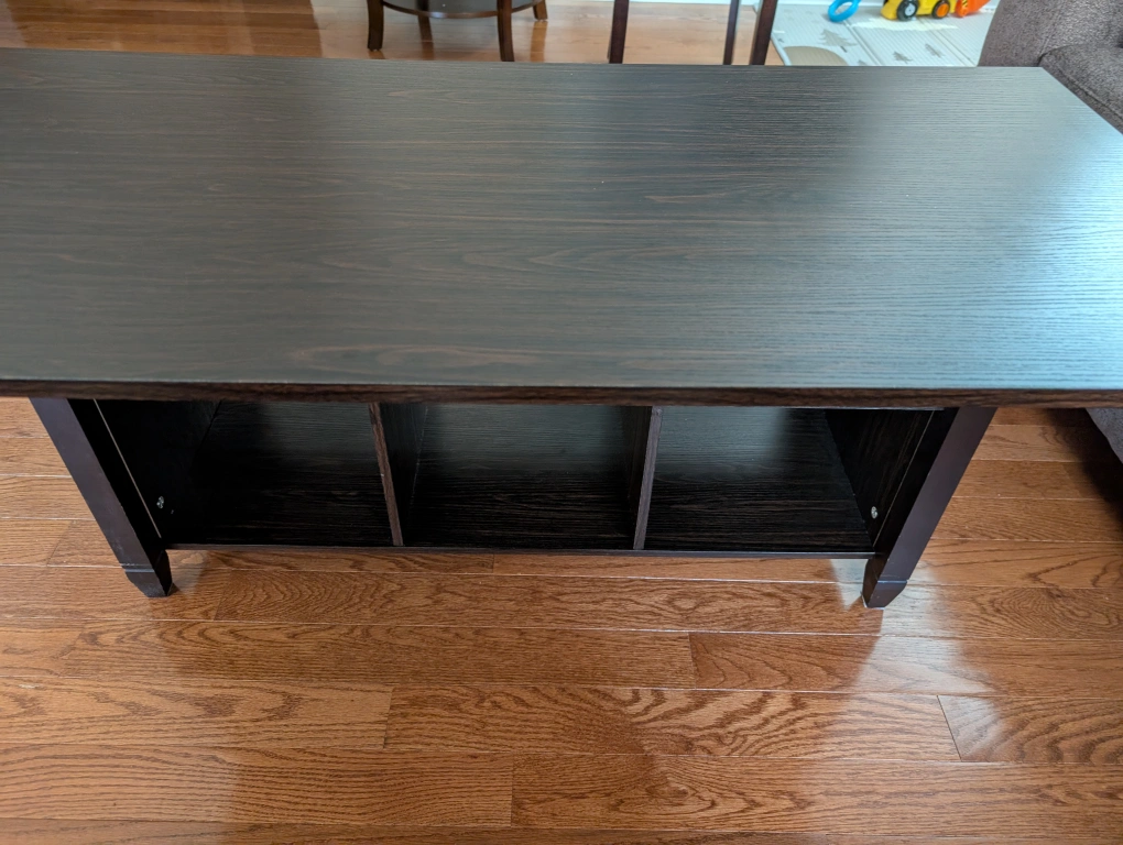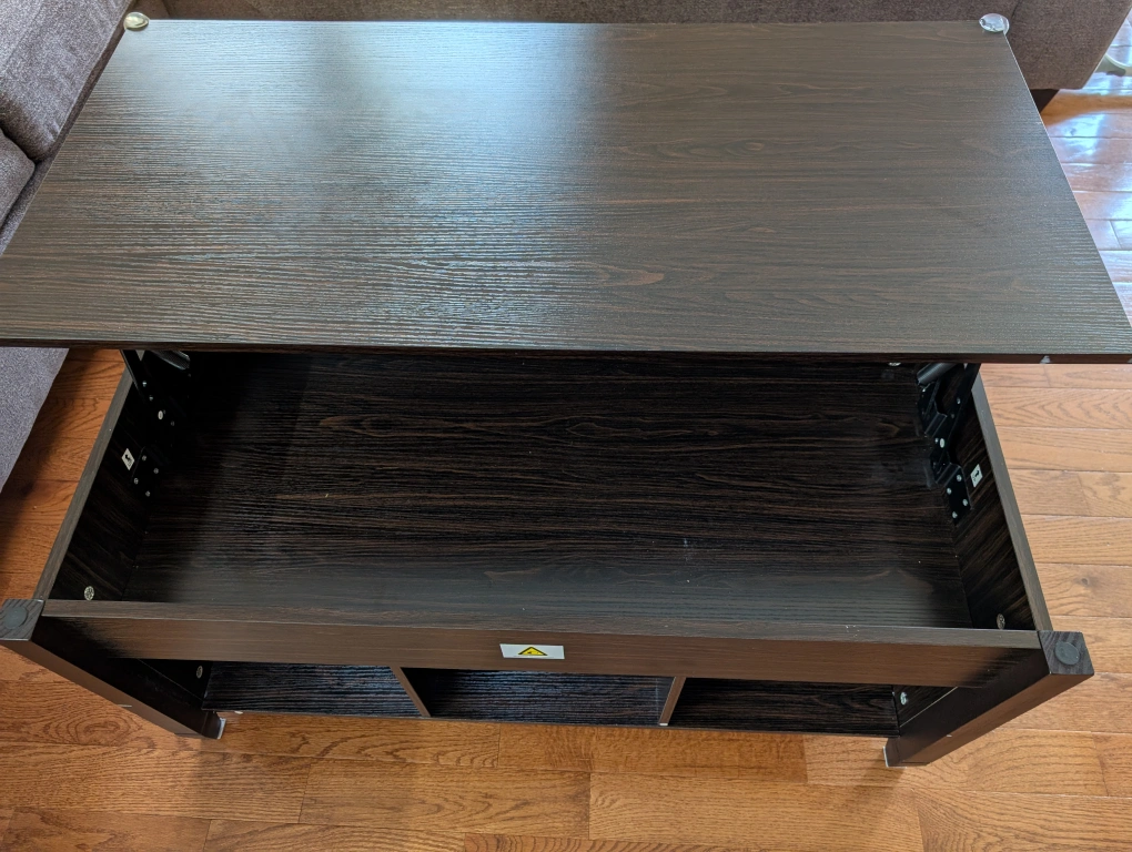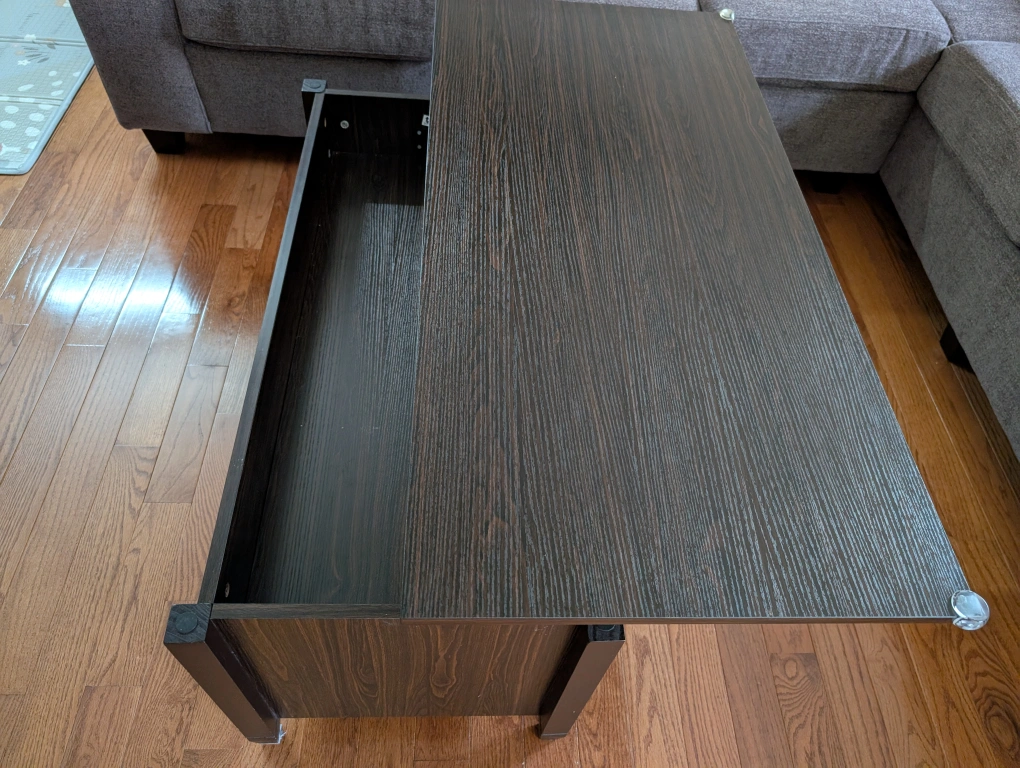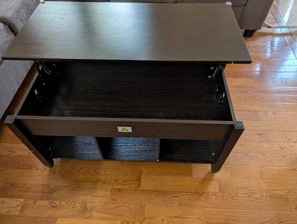 Selling a lift-top coffee table in a dark brown colour. It's in great condition, gently used and has a handy lift-top feature for when you need a higher surface. It also has storage underneath!