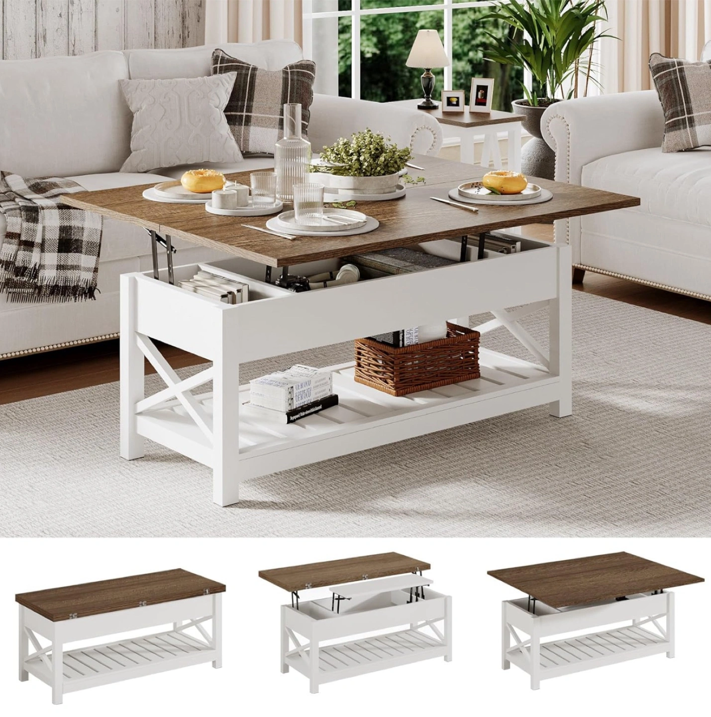 Selling a lift-top coffee table with a wood top and white base. It's perfect for living rooms and dens! The dimensions are approximately 39.4" x 39.4" x 18.5". It's a great piece for adding both style and functionality to your space