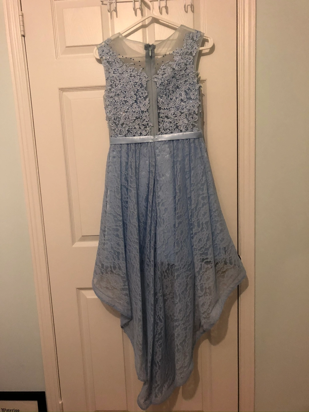 This dress is a beautiful light blue high-low with a lace bodice and a sheer back. It has a satin ribbon belt and is perfect for prom or other special occasion.