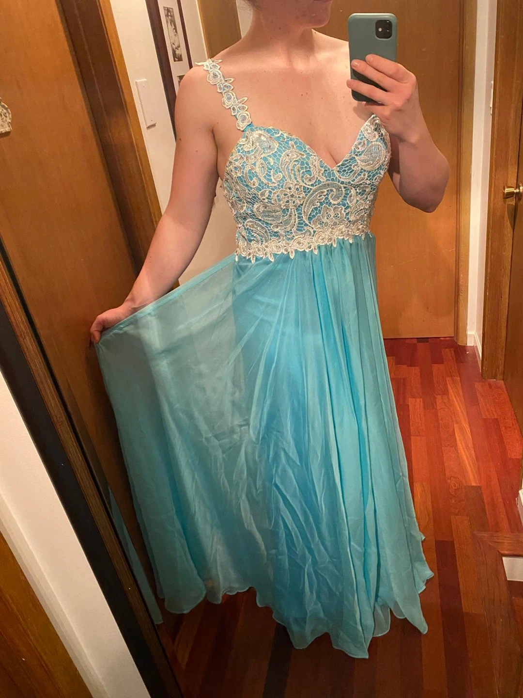 111Selling a beautiful light blue formal dress. It has a detailed white lace bodice and flowing skirt. Perfect for prom or any special occasion! Only worn once, size 12