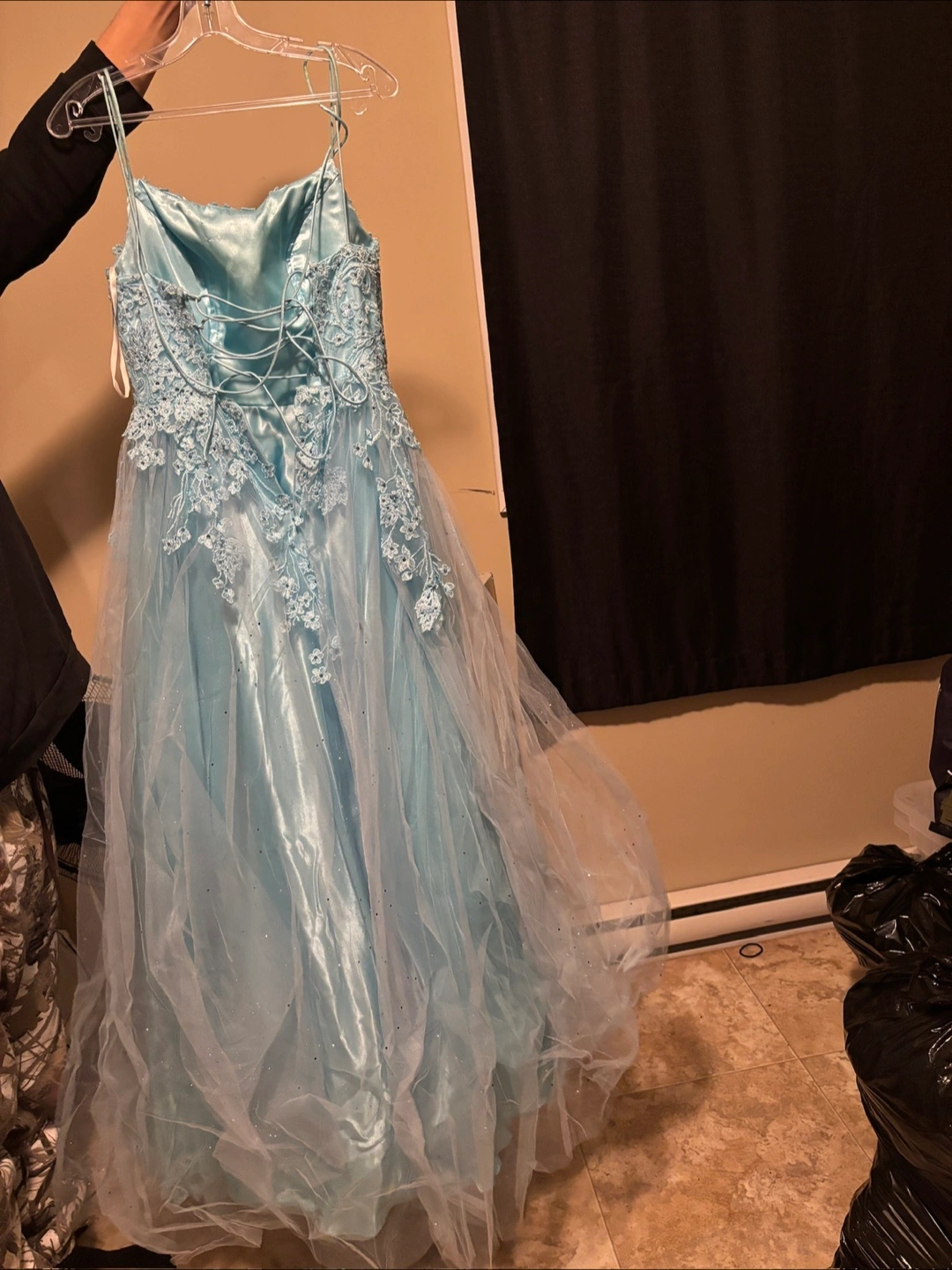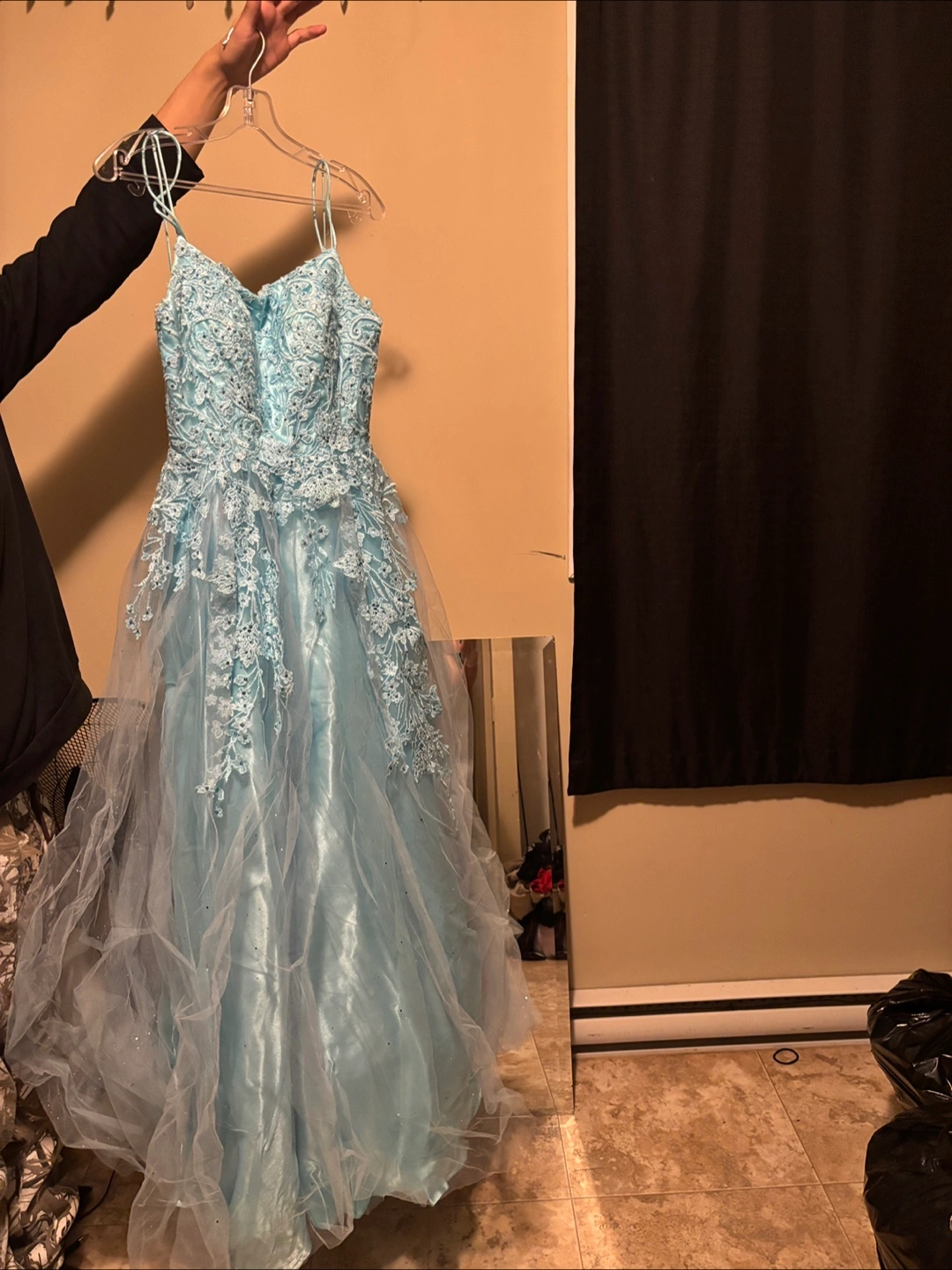 Selling a beautiful light blue prom dress. It's a size 6 and features delicate lace detailing. Perfect for a special occasion! Only wore it once still in great condition! Message me it is available!