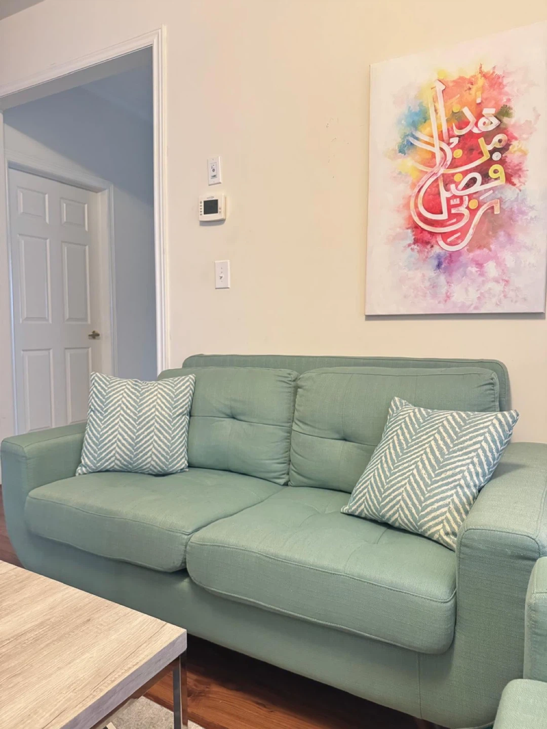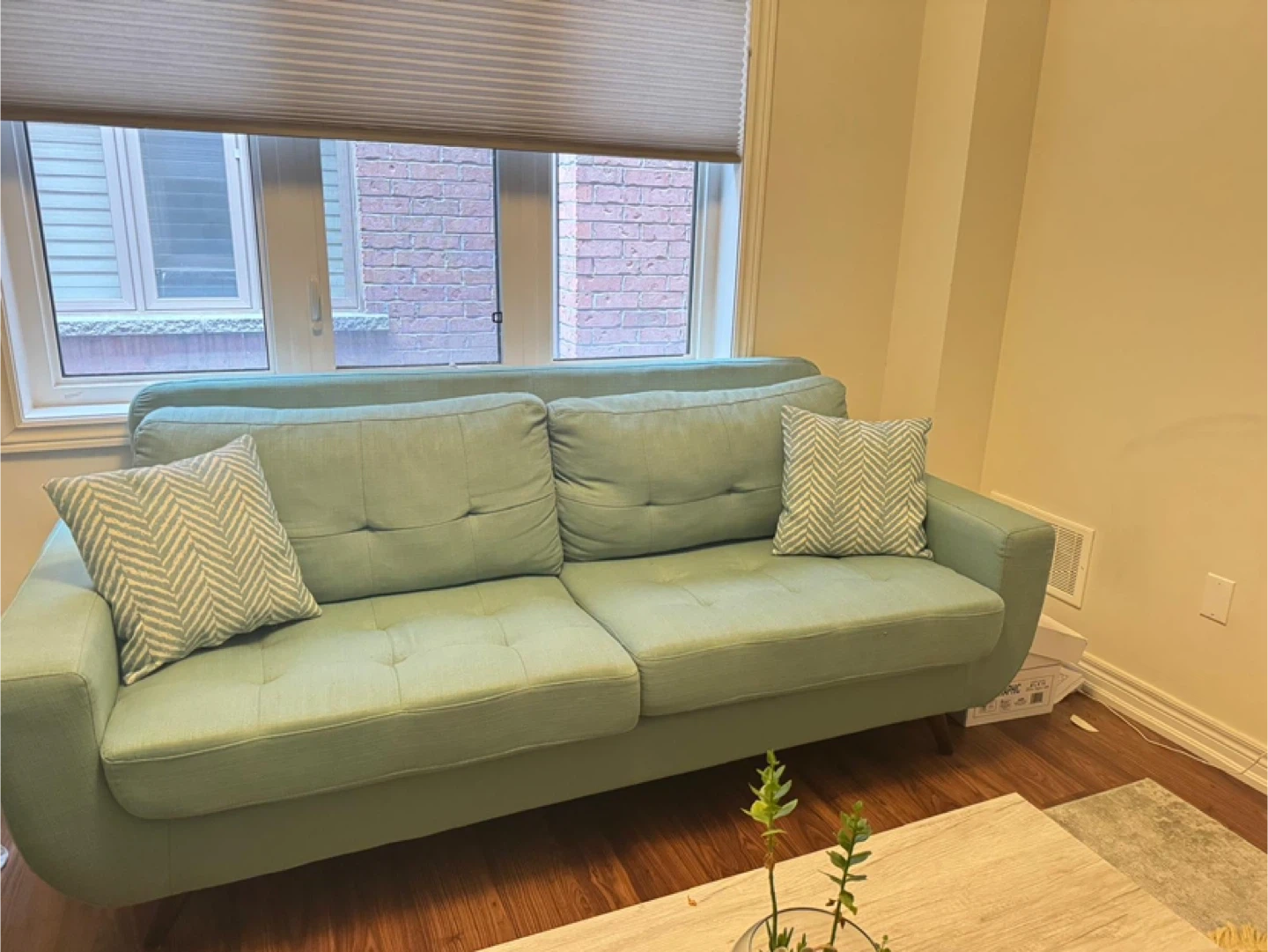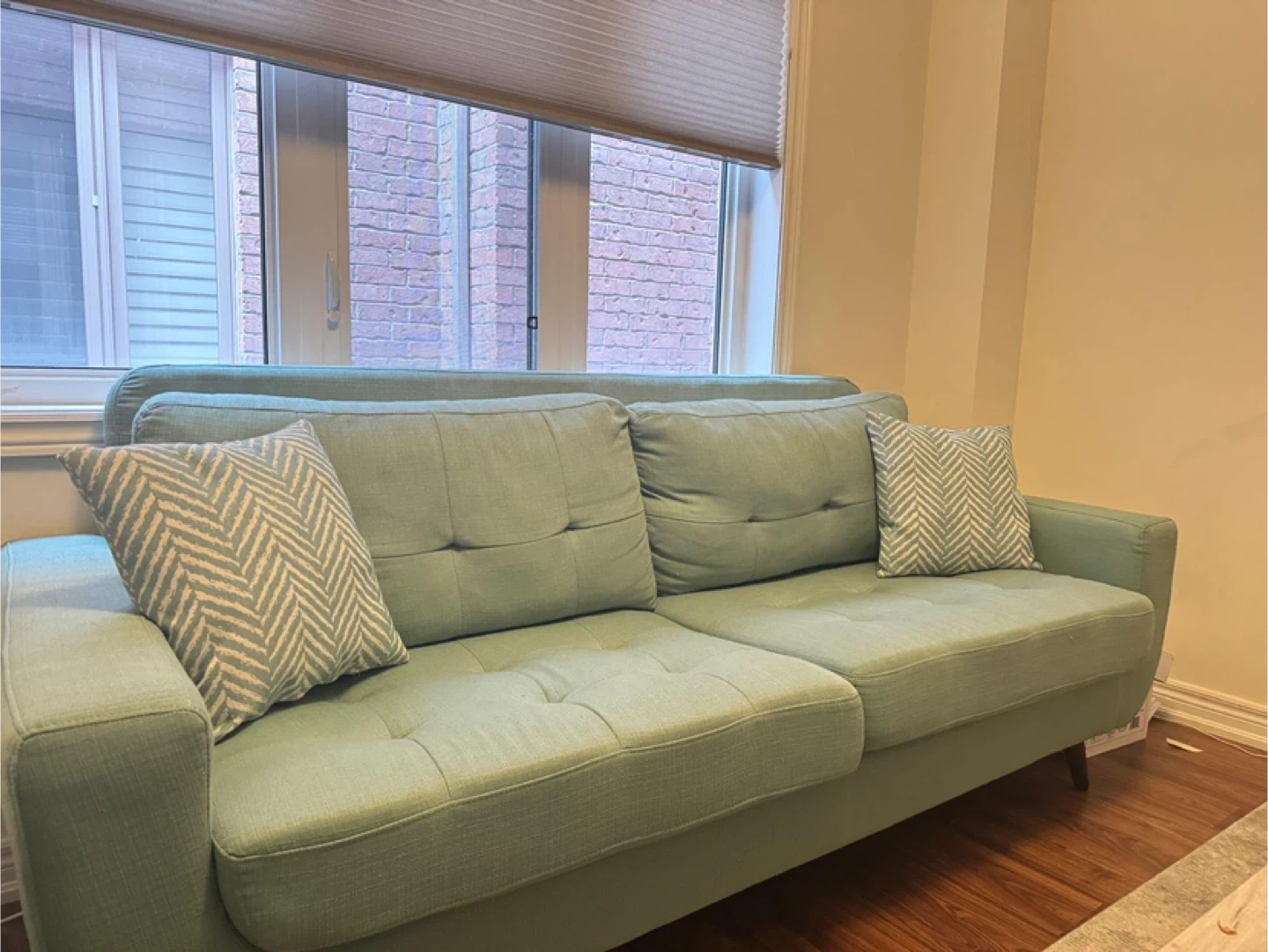 Selling a comfy light green sofa. It comes with the pillows shown in the pictures. It's in excellent condition and would be a nice addition to any living room! 2 couches. Bought originally for 999.99 from Leon’s. Message me for pick up arrangements. Ready for pick up after October 10th.