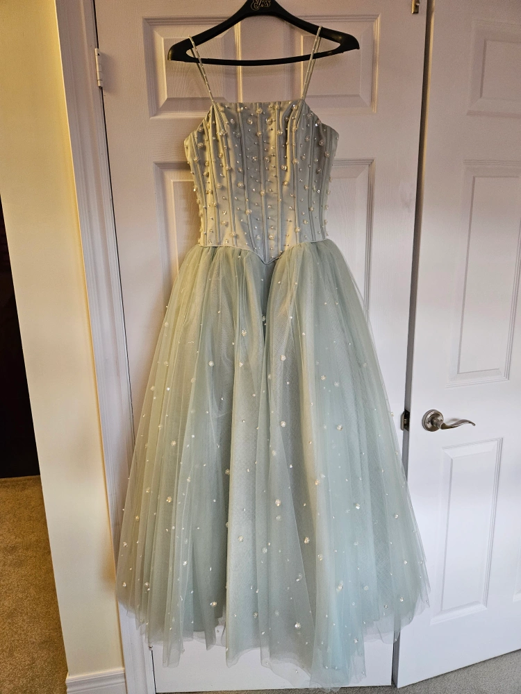 10Selling a beautiful light green tulle dress! It features a corset-style bodice with delicate beadwork and a full, flowing tulle skirt. Perfect for a special occasion. size 4 small for adult.