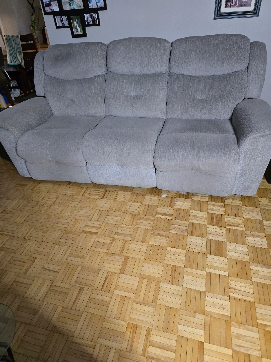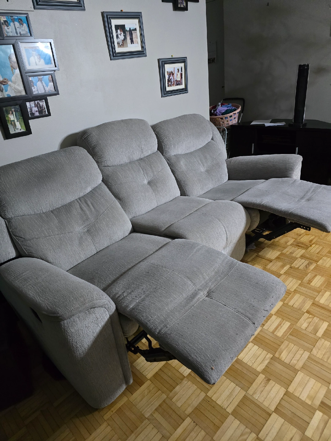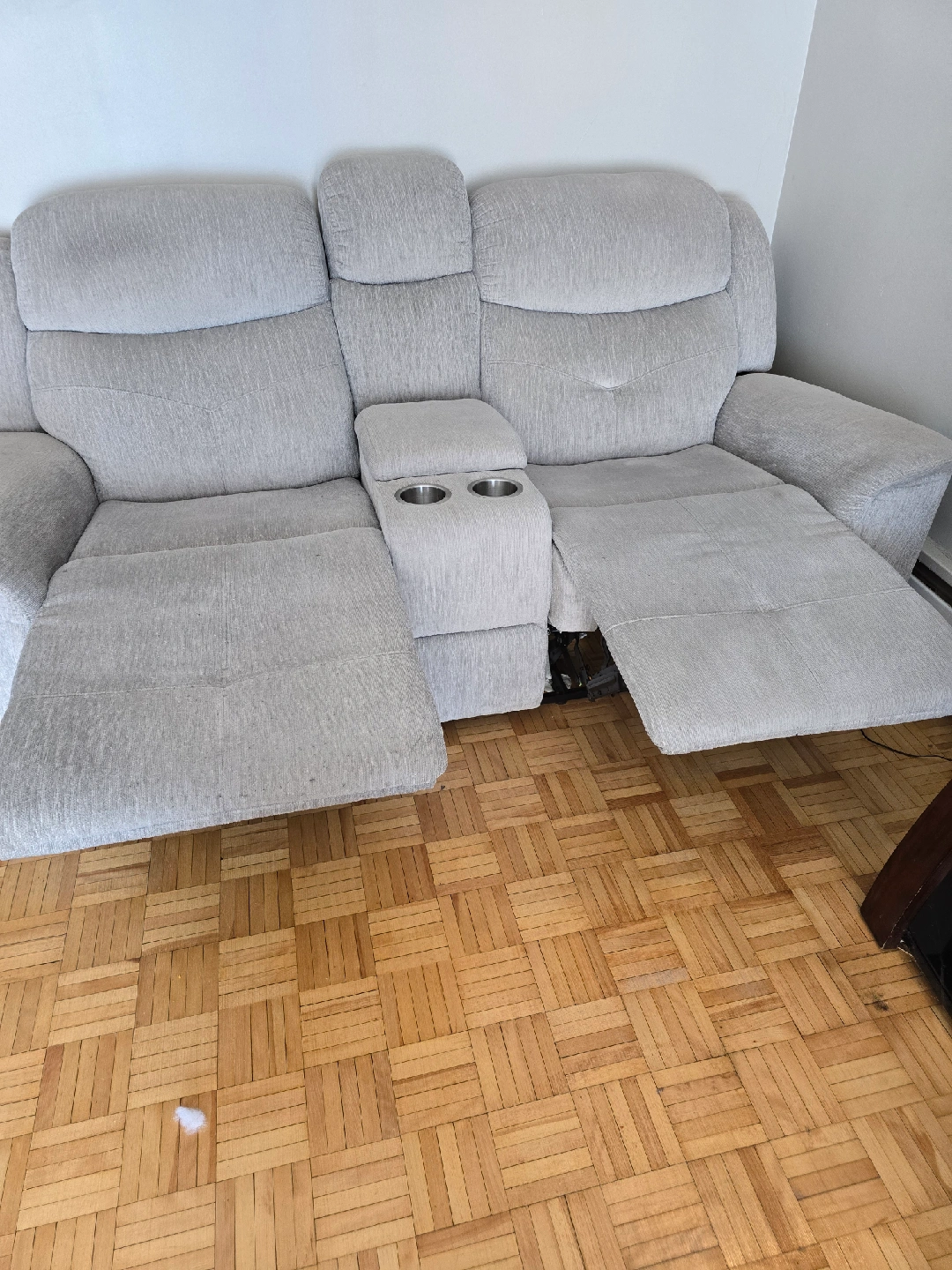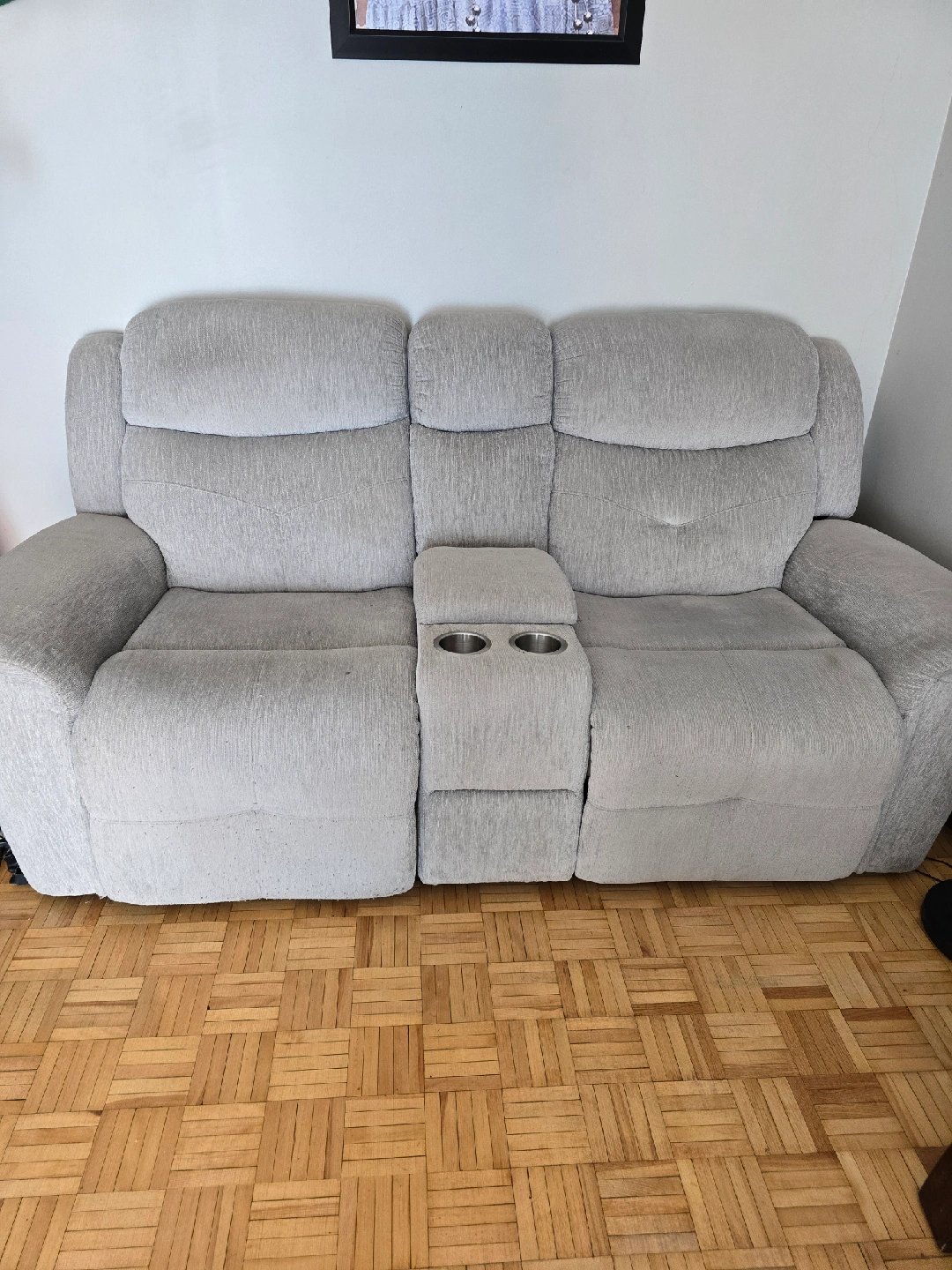 76Selling a comfy light grey reclining sofa. It has a convenient center console with cup holders, perfect for movie nights or relaxing with a drink! The reclining feature works great on both ends. It's in good condition and ready for a new home. A 3 seater matching set is also included. Only available for pickup.