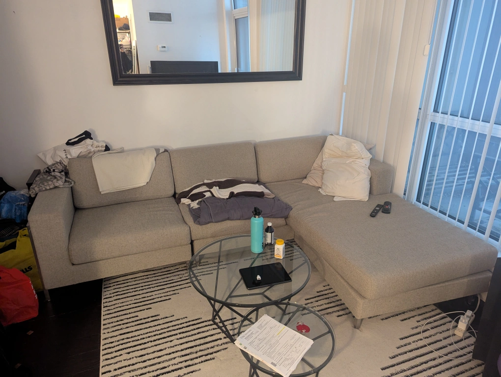 40Modern light grey sectional sofa. Includes chaise lounge. Good condition. Some wear and tear. no stains or pets. condo usage last 5 years.