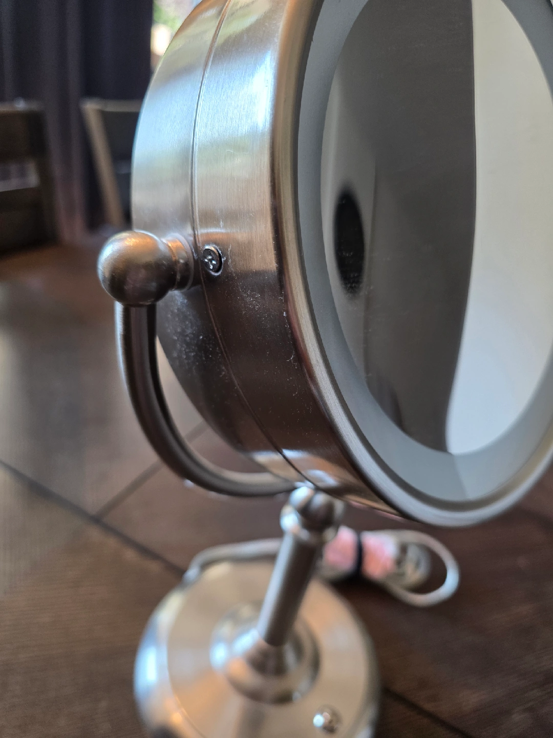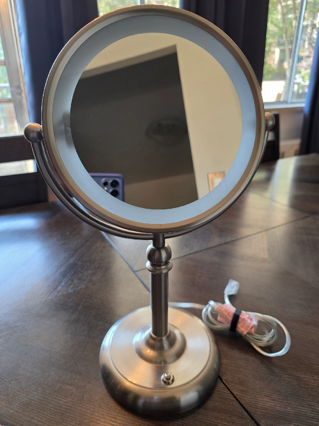 14The object in the image is a Sunter LED Natural Daylight Vanity Mirror. The mirror is dual-sided with 1x and 10x magnification. It features a fully adjustable head that rotates 360 degrees. The mirror uses a full-spectrum LED bulb that replicates natural daylight. Pick up Dawes Road and Danforth area Please see my other ads
