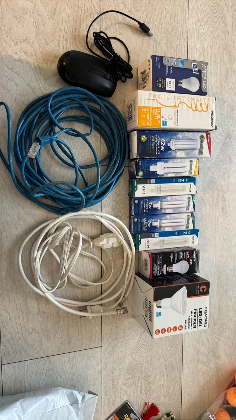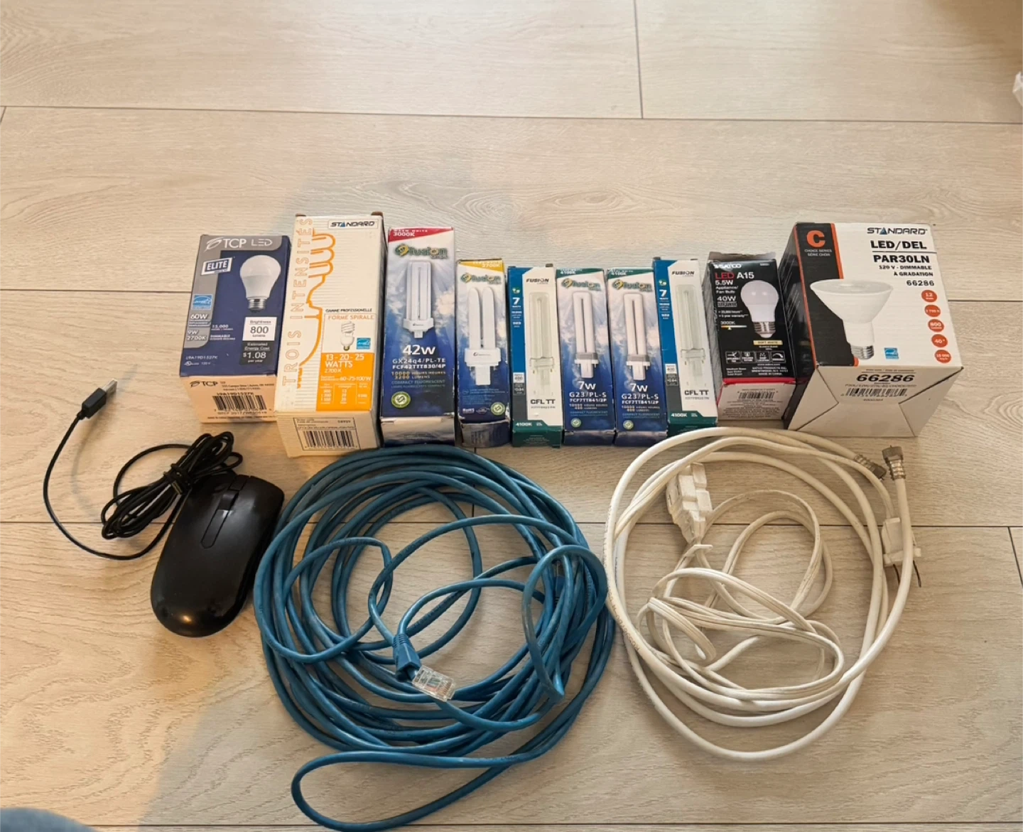 Moving Sell Selling a mixed lot of lightbulbs and various cables. Includes LED and fluorescent bulbs, as well as network and power cables. All new. Pickup Surrey Central Station.