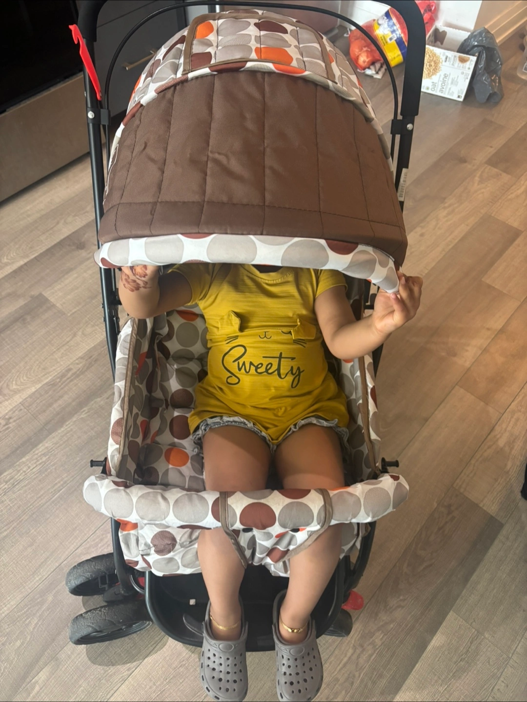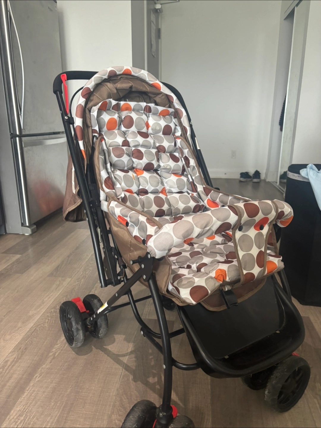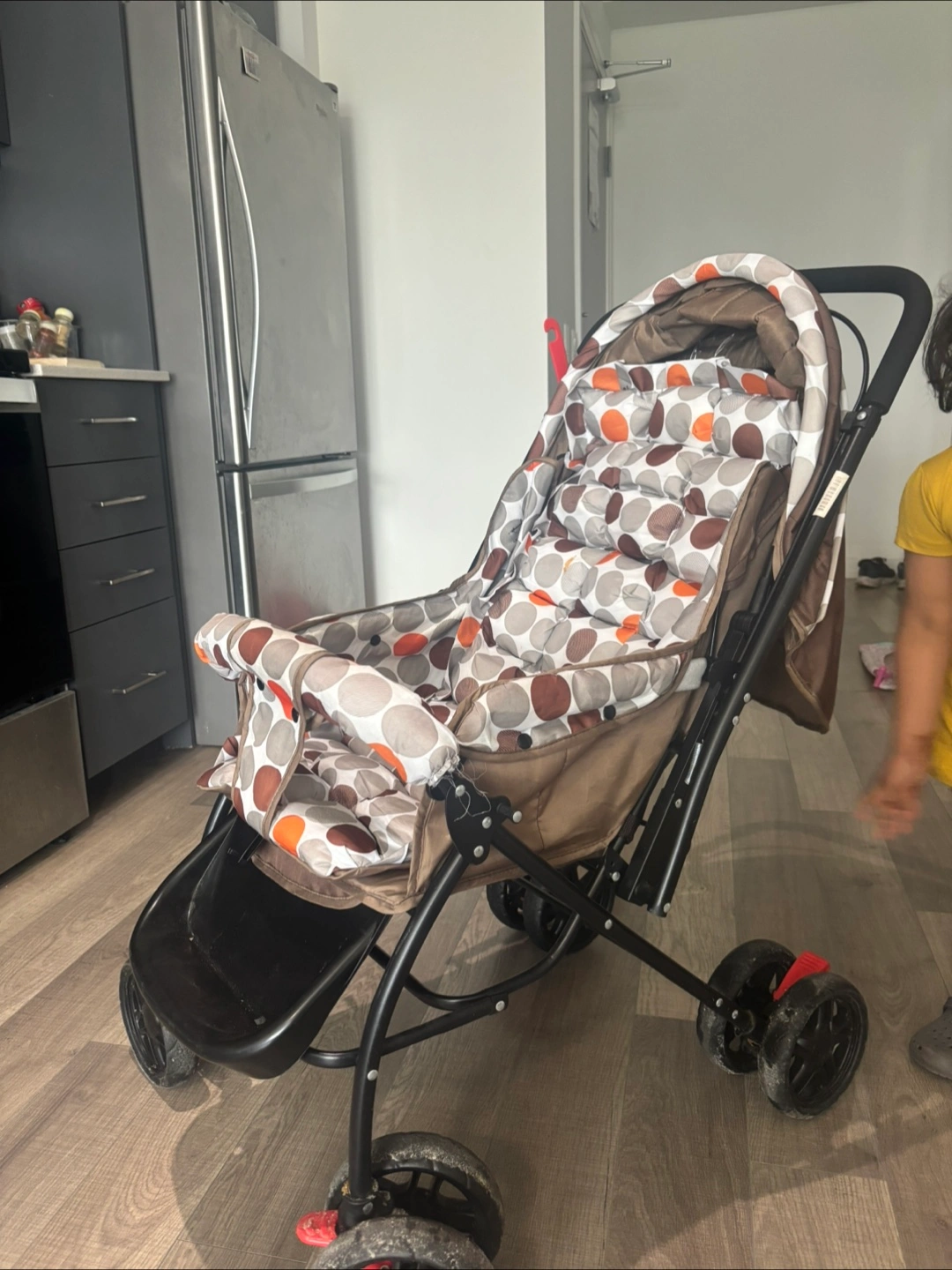 A stroller with a patterned fabric seat and sun shade. Brown and black frame, with black wheels and red accents. Ideal for leisurely walks in the park.