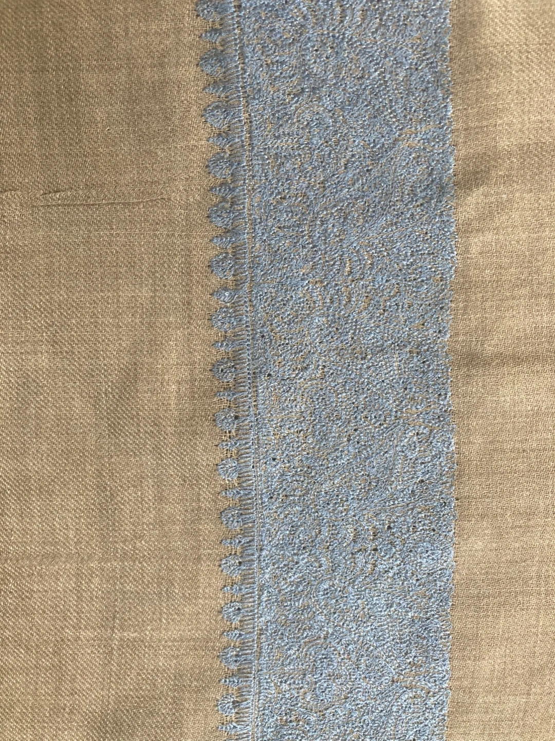 147Neutral sand colour with contrasting light blue embroidery. Has some imperfections (see pics) but otherwise in good condition. Measurements: 45 x 91 inches