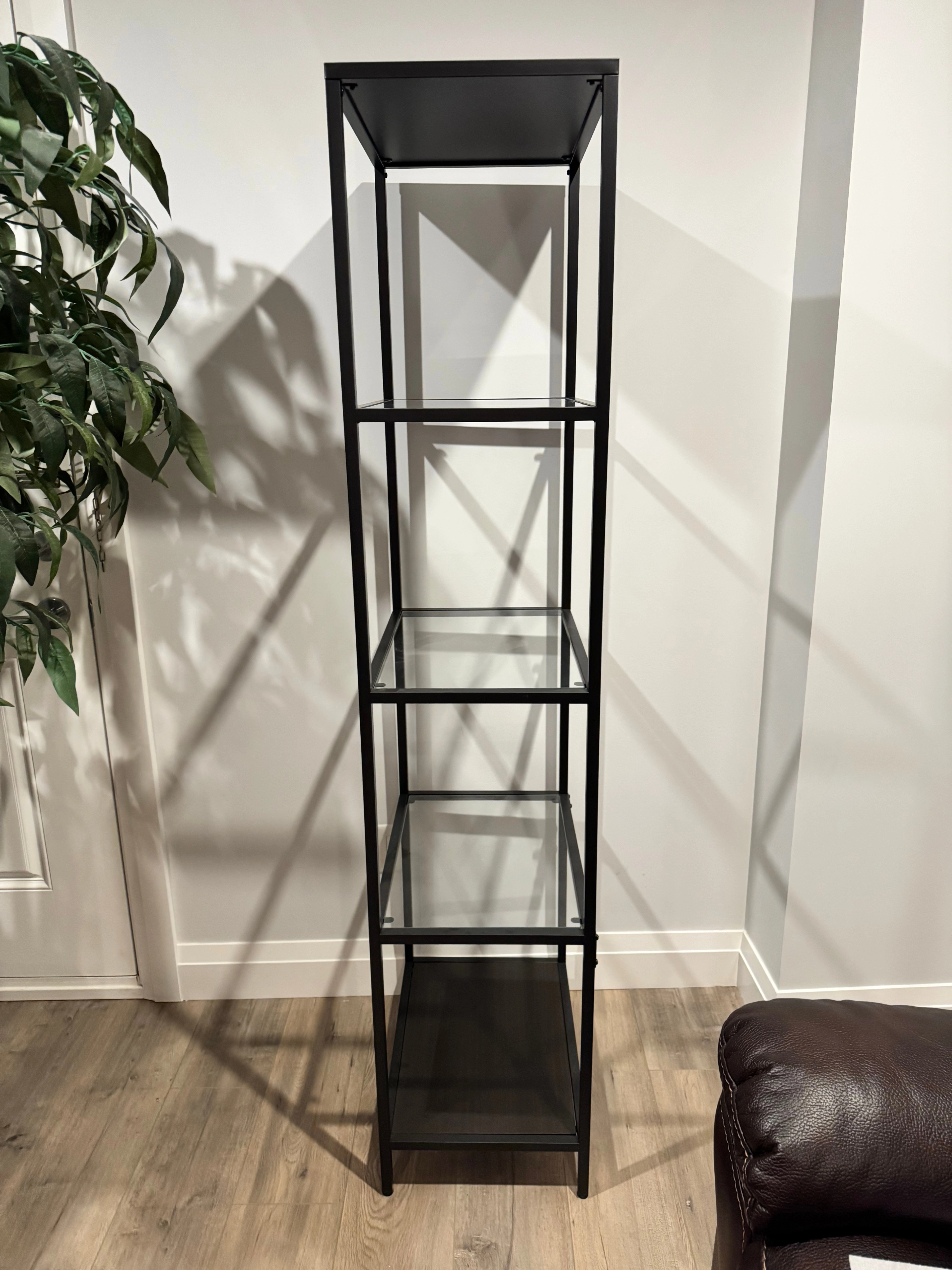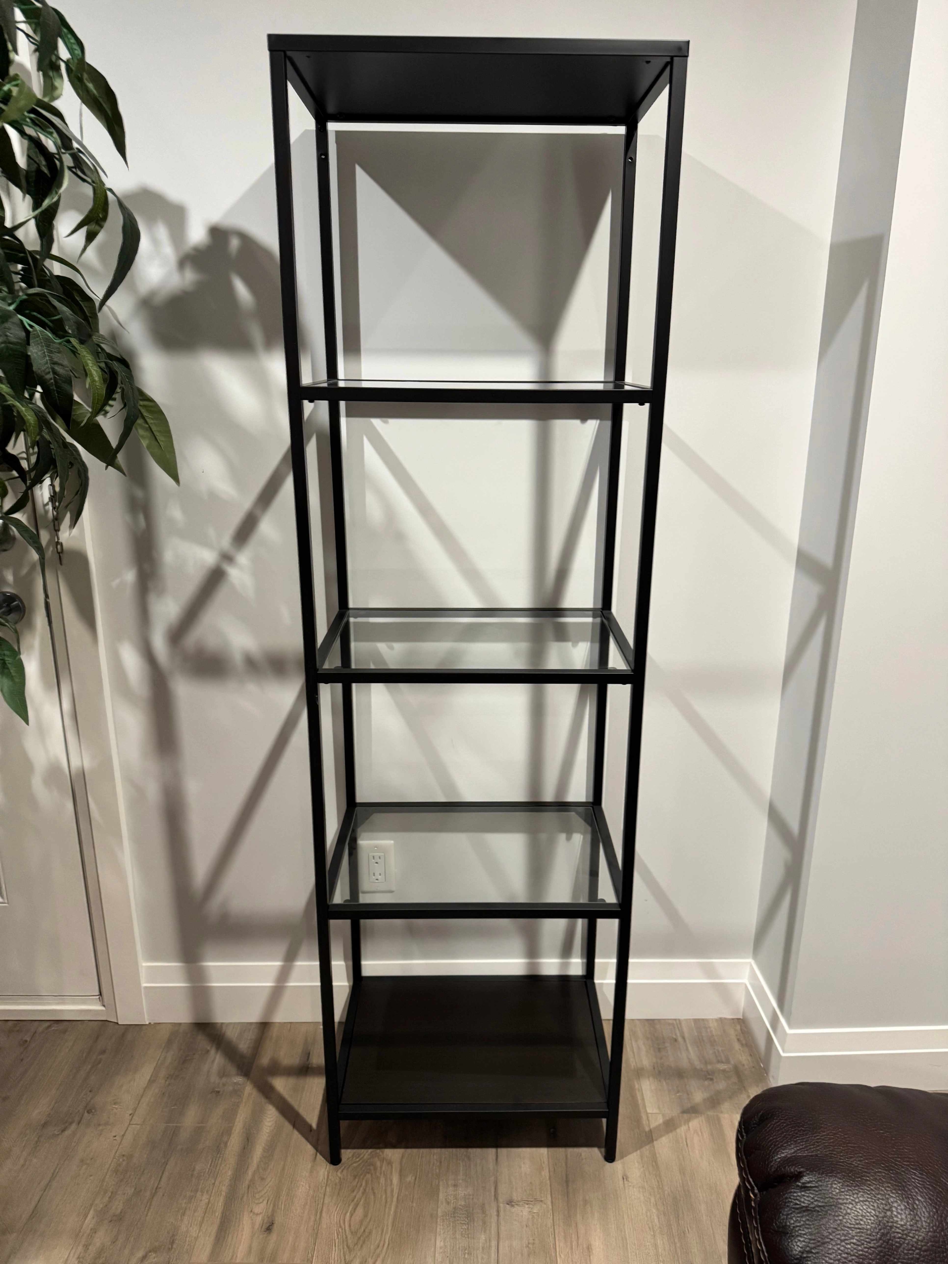 Stylish and functional black-brown frame with tempered glass shelves Dimensions: 20โ1/8 in (width) ร 14โ1/8 in (depth) ร 68โ7/8 in (height) Minimal design, ideal for books, decor, and display. In clean, well-maintained condition Price: $40 Pickup: Lynn Valley Centre