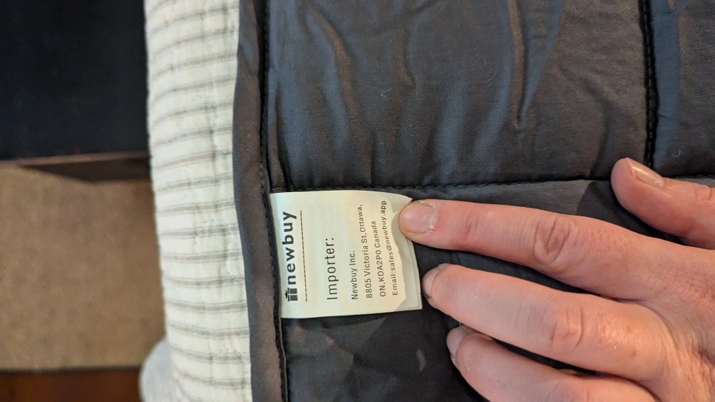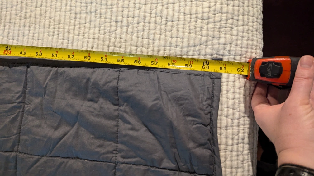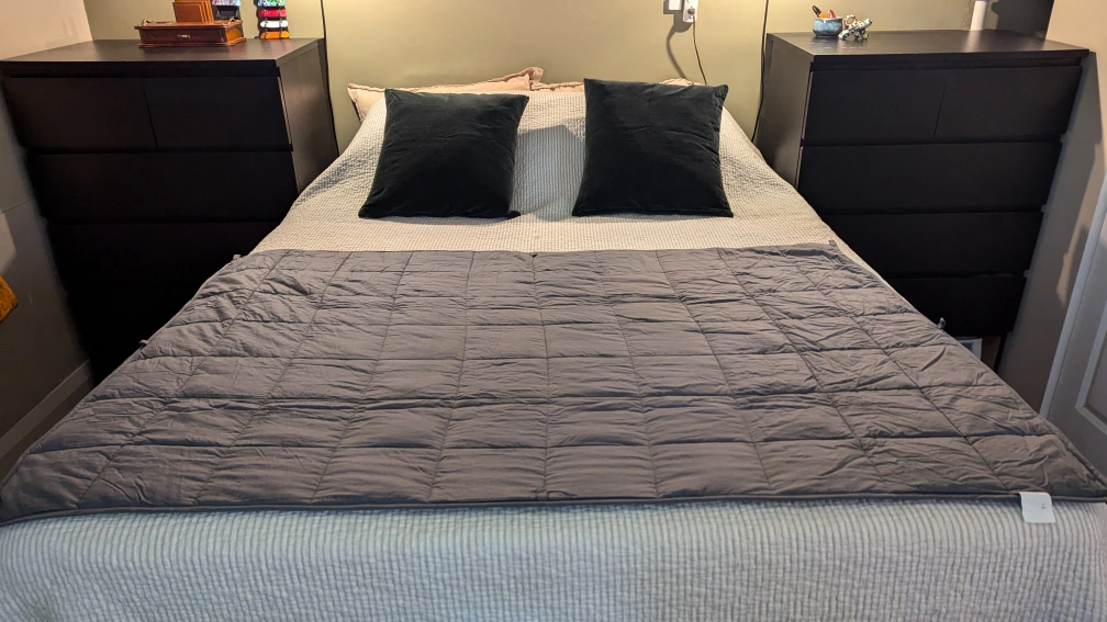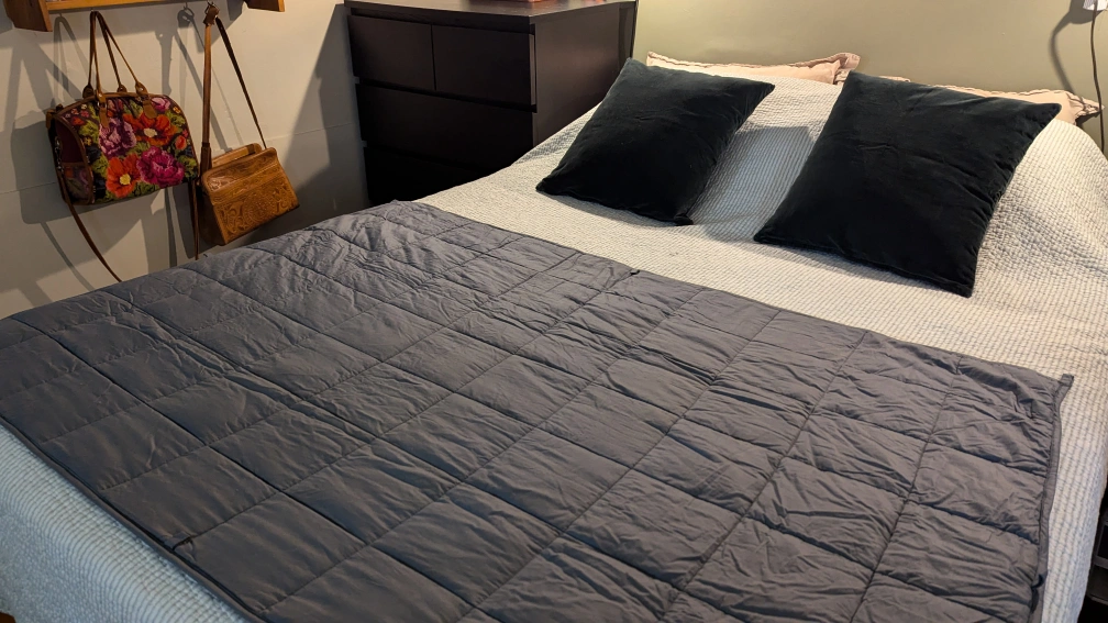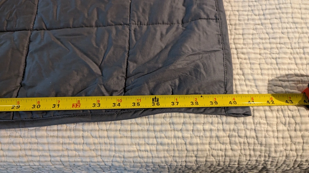 411Grey weighted blanket - 15 lbs. It is quilted with glass beads and is equipped with fabric tabs to attach to a blanket cover/case. Was used only for a few nights with a cover - we ended up getting a queen size one. this one would be great for one person or on the couch!