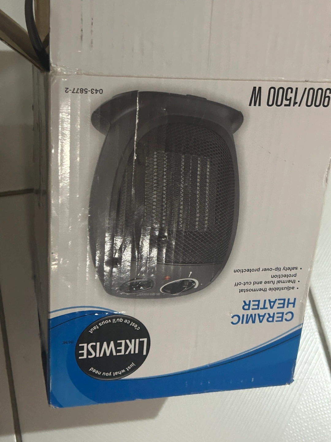 13Likewise brand ceramic heater. Adjustable thermostat, thermal fuse and cut-off, safety tip-over protection.