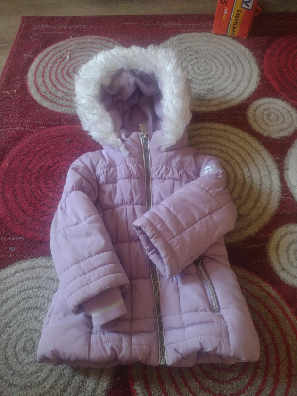 10A cute lilac puffer coat perfect for keeping your little one warm! It features a soft fur hood and a cozy quilted design