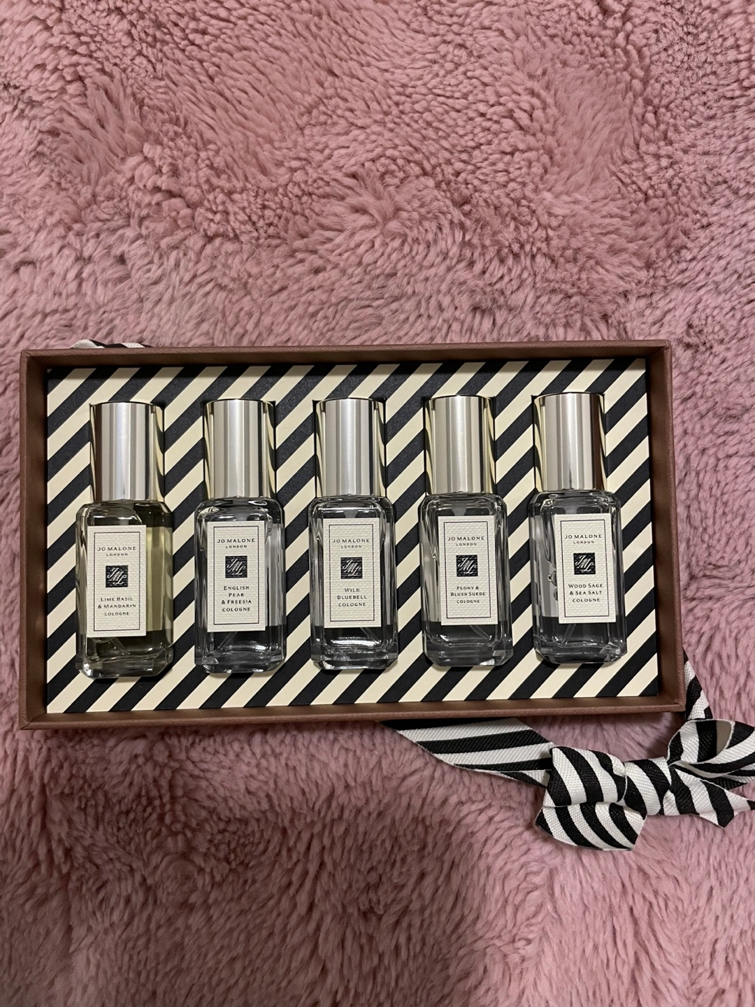 20A Jo Malone cologne set. Includes a variety of scents, each in a small spray bottle. A cute box with a black and white striped ribbon. Imagine using this set to try new fragrances and find your favourites, what a treat.