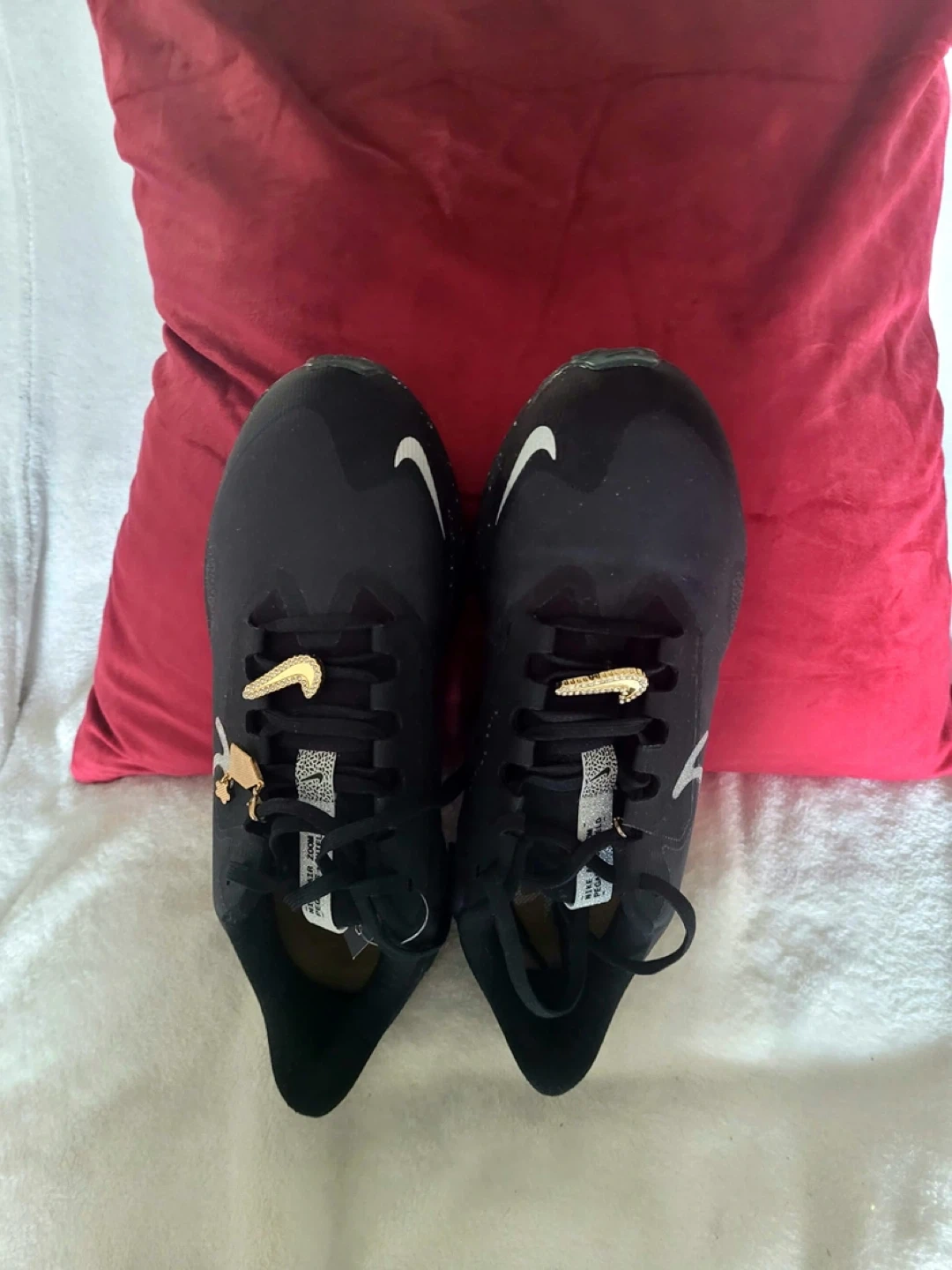 10Limited Edition Nike Sneakers - New Description Brand new, limited edition Nike sneakers featuring black shoes with striking gold accents and white swoosh logos. These stylish runners come with gold Nike swoosh charms on the laces for added flair. Details - *Condition*: New, never worn. - *Color*: Black with gold accents and white swoosh logos. - *Limited Edition*: Unique design with gold Nike swoosh charms. Perfect for Sneaker enthusiasts looking for a limited edition pair of Nikes with a touch of luxury.