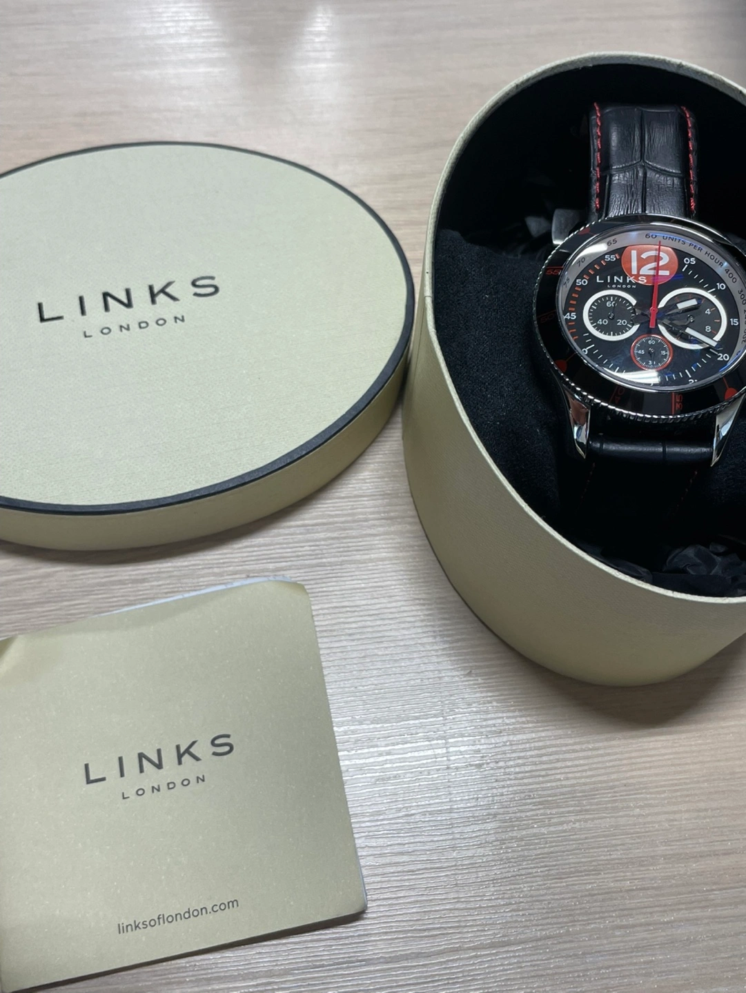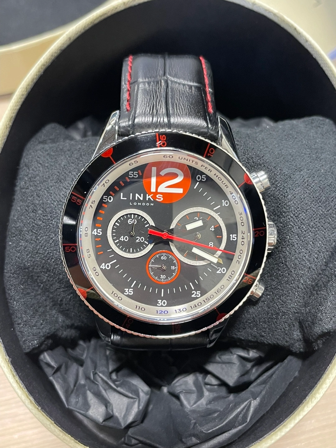 15Selling a stylish men's watch from Links of London. The watch features a black face with red accents and a black leather strap. It comes with the original box and paperwork, making it a great find! Needs new battery