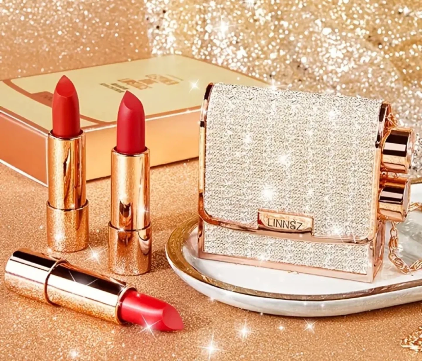 20Selling a LINN&Z lipstick set that comes with a mini bag! The bag is a cute, square shape with a gold chain. The set includes three lipsticks to complete your look. The bag is 3.15 inches by 3.15 inches.