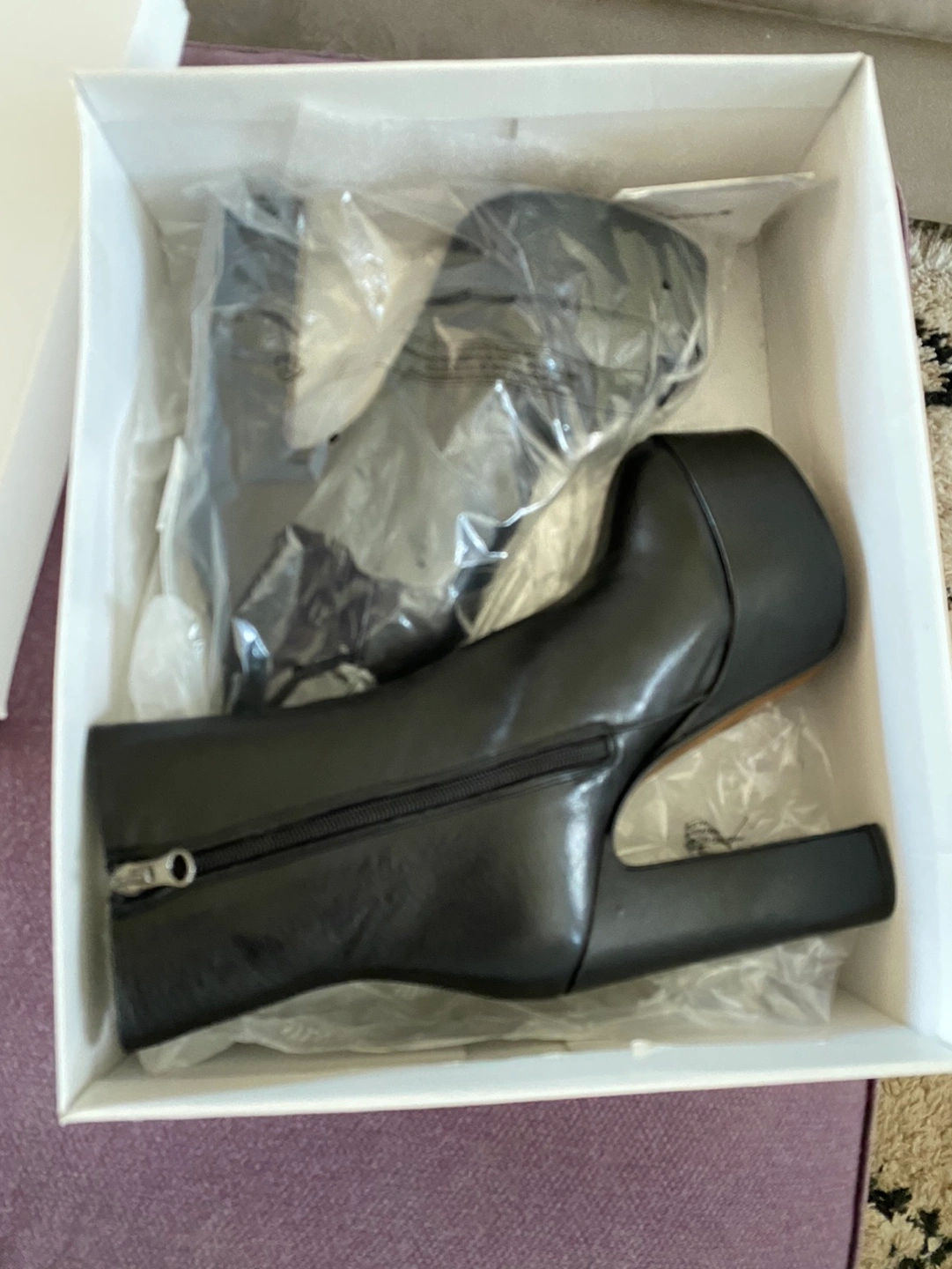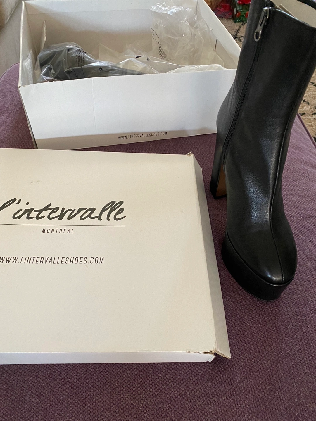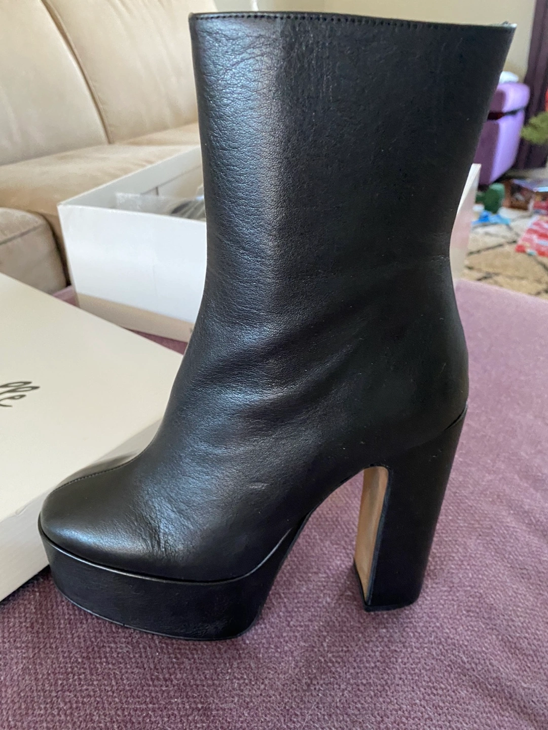 Never worn. Black leather platform boots with a high heel and zipper closure. Comes in original box.
