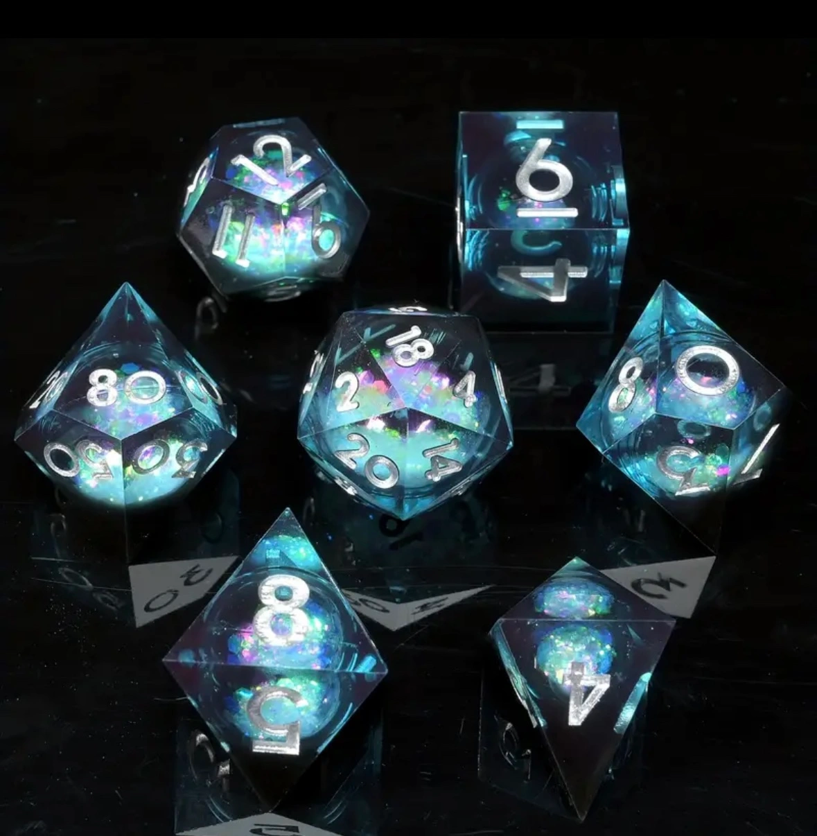 1000+Brand new in bag set of 7 dice... These are liquid core, the glitters inside move like a snow globe!!! Super cool and entertaining for any game! Happy to share a video of them. I have one set I use so selling this extra one. All prices are flexible, feel free to make an offer or bundle for discounts! π