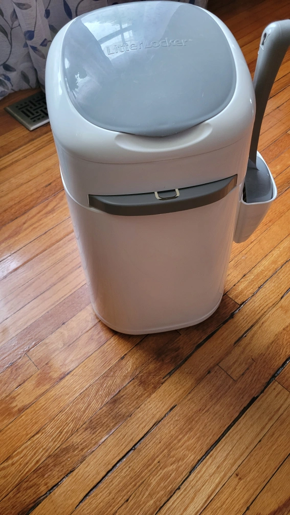 This is a self-cleaning litter box, designed to help make keeping your cat's litter box clean easier. It is in good condition and ready to be used. It comes with a scoop. The scoop is in good condition and has a plastic handle. It is beige and grey in colour and comes with a carbon filter. The brand of the product is Litter Locker. It is in good condition and ready to be used. It comes with a scoop.