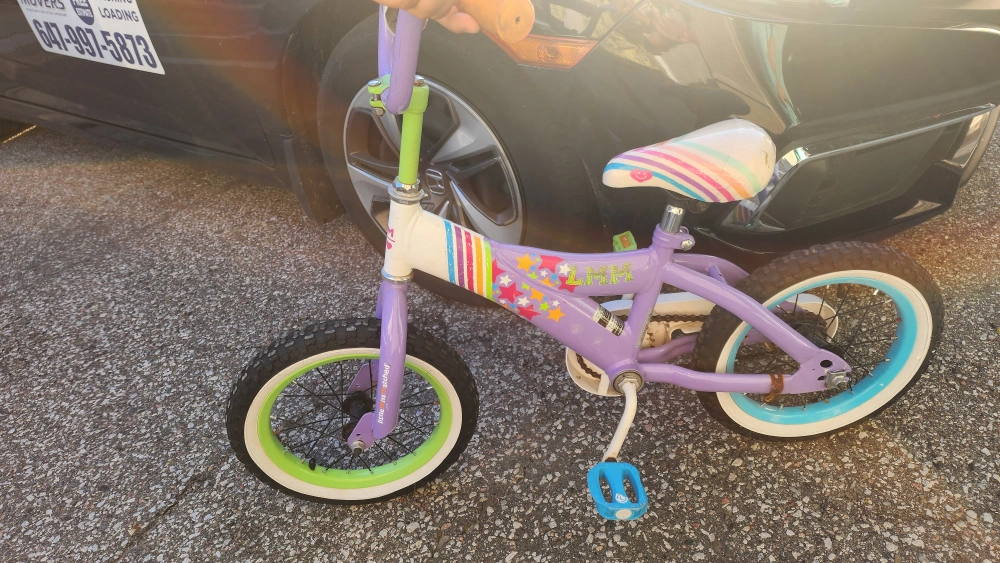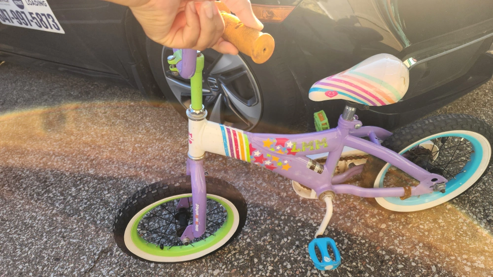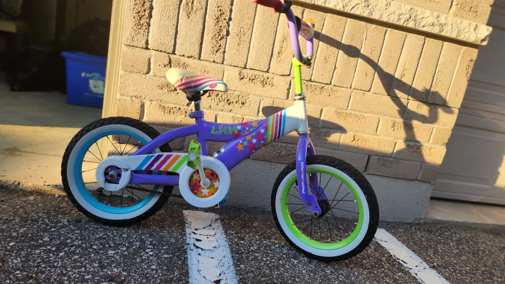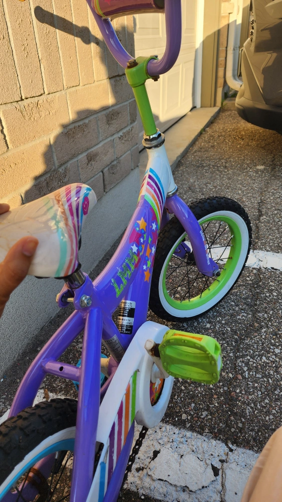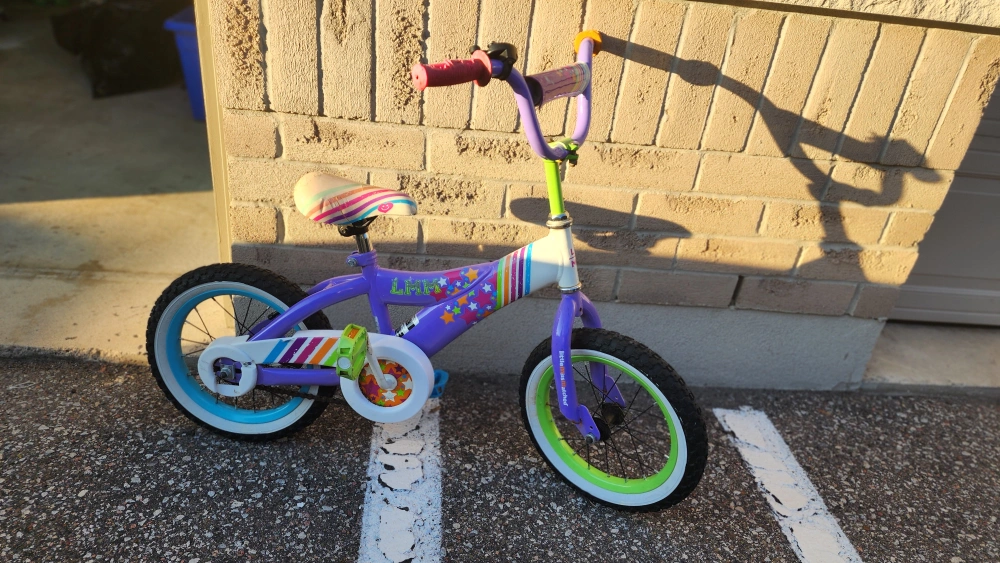 Here's a cute Little Miss Match 12-inch bike for kids! It features a fun purple and white design with colourful accents. Perfect for little ones learning to ride!