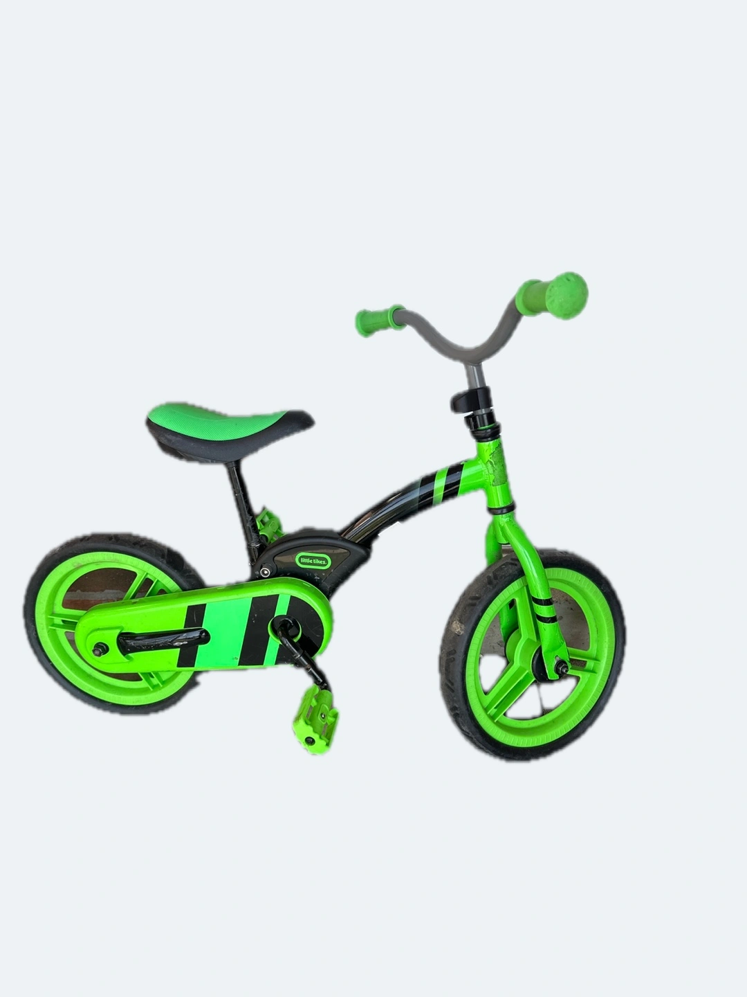 Kids' balance bike. Bright green frame with black accents. Suitable for toddlers learning to ride. Pedals built-in.