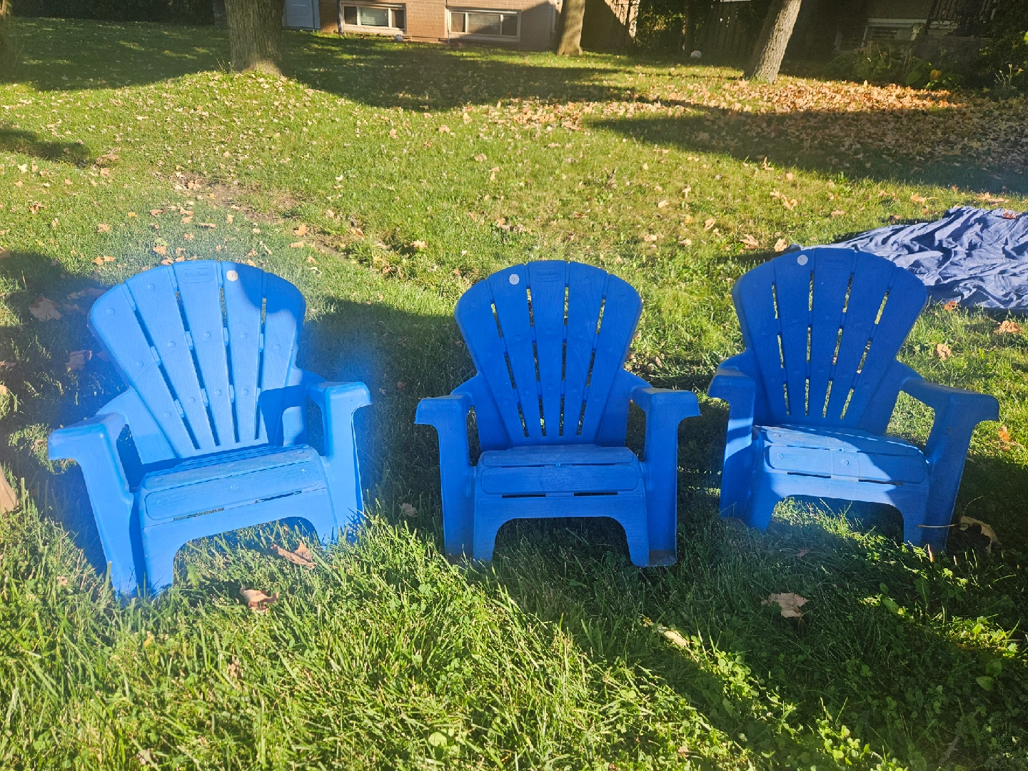 Selling three Little Tikes Adirondack chairs for kids! They're blue and perfect for outdoor fun in the backyard or on the patio. They are ready for a new home