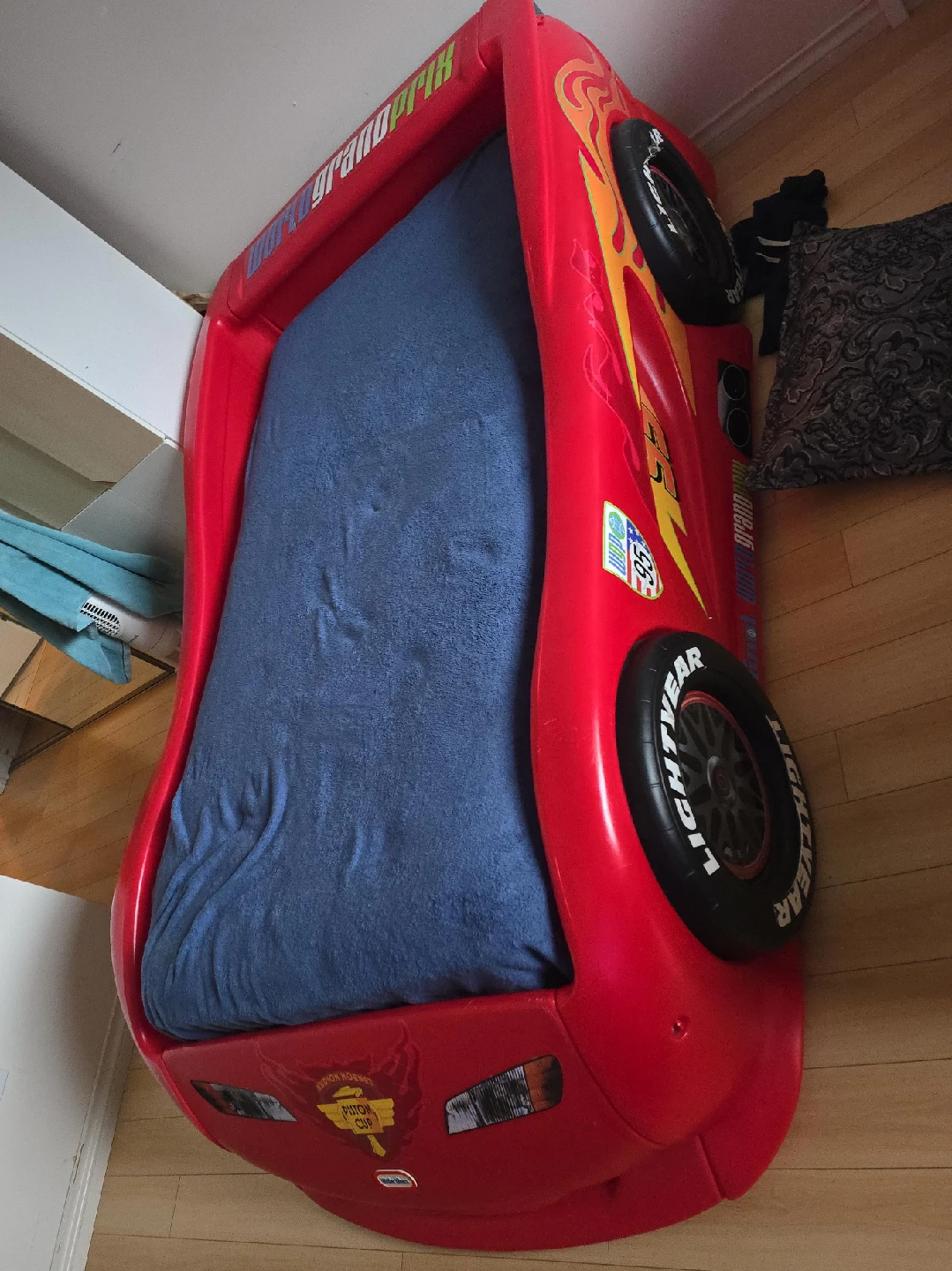60Vroom vroom! This Little Tikes Lightning McQueen car bed is ready for a new racer. It's in great shape and would be perfect for a toddler transitioning to their first big kid bed. The vibrant red colour and fun design will make bedtime an adventure!