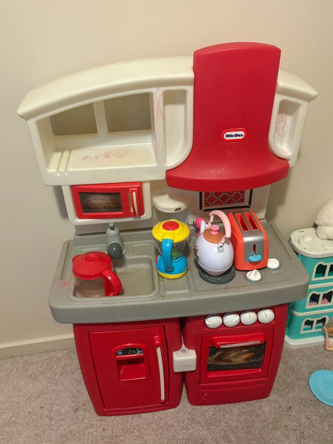 86A fun Little Tikes toy kitchen, perfect for your little chef! It has a sink, stove, oven, and even a little fridge. It shows some signs of use, but still has lots of play left in it