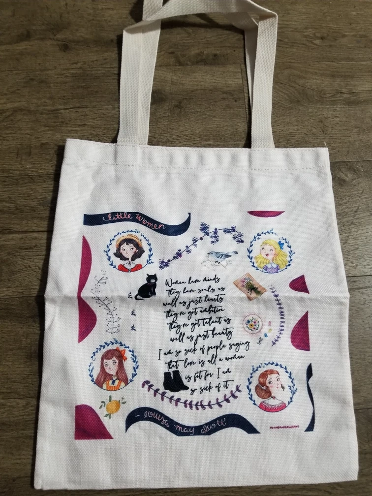 240Check out this cute tote bag featuring illustrations and a quote from Little Women! It's perfect for carrying books or groceries, and showing off your love for classic literature. Brand new