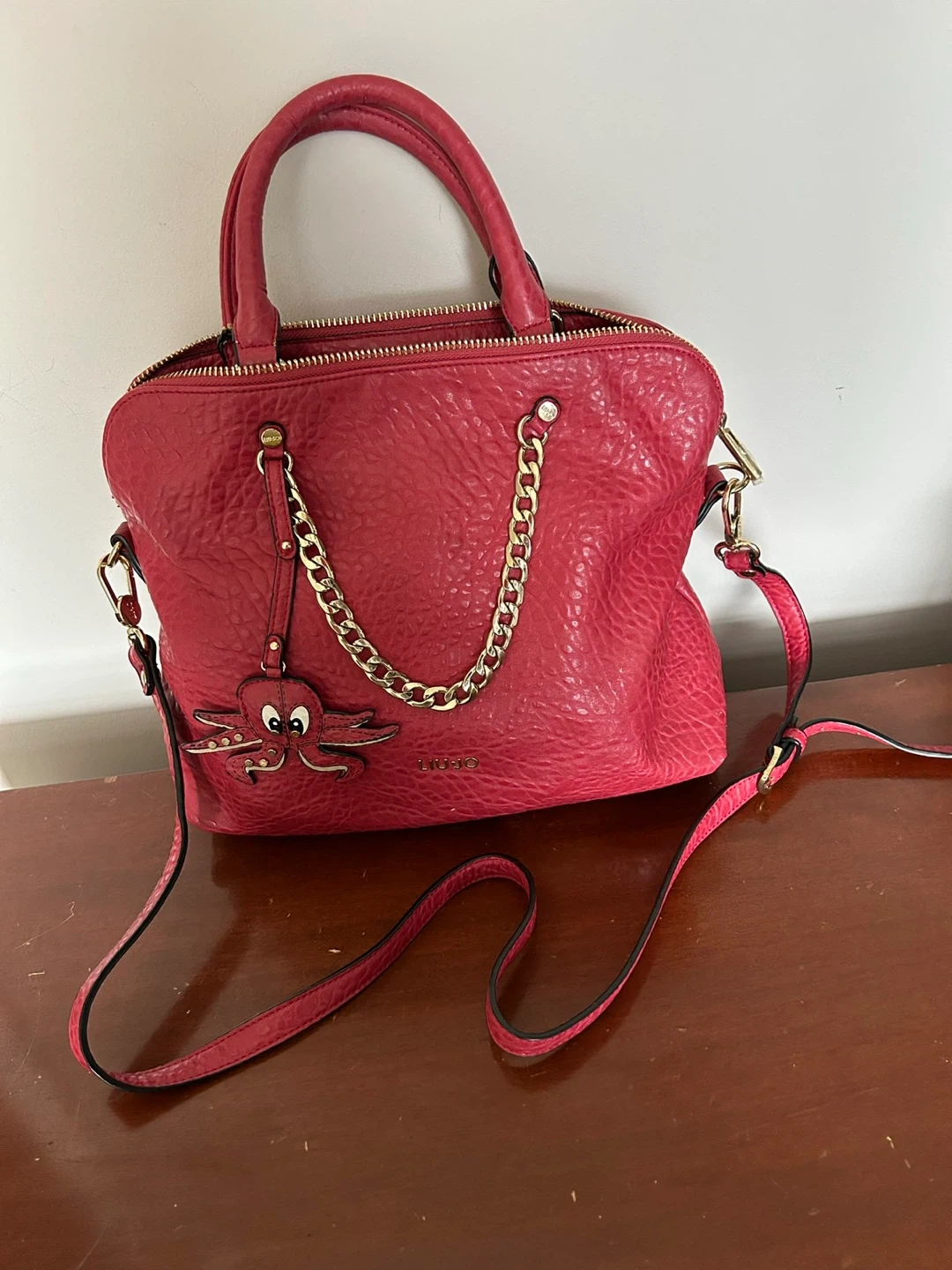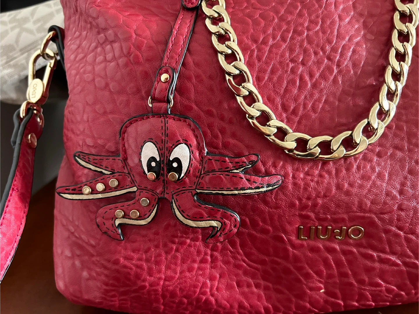5This is a LIU JO handbag in red leather. It features a gold chain and a fun octopus charm. Perfect for adding a pop of colour to any outfit!