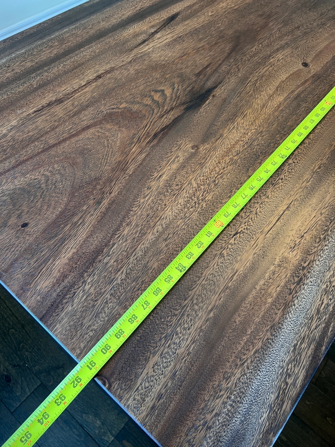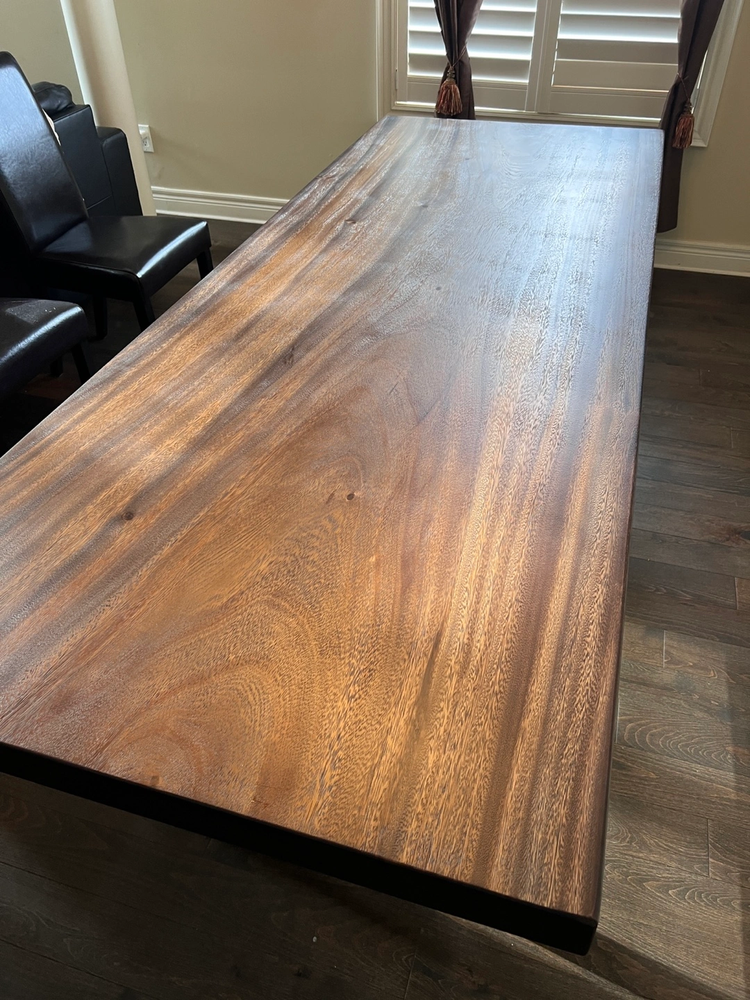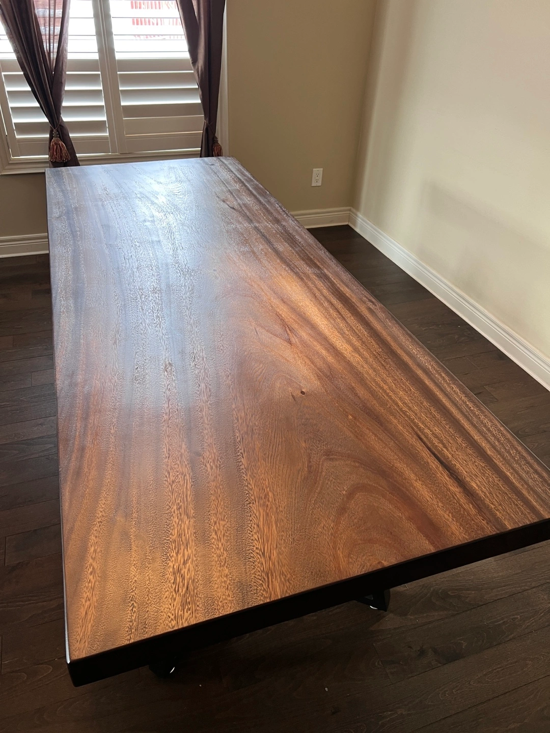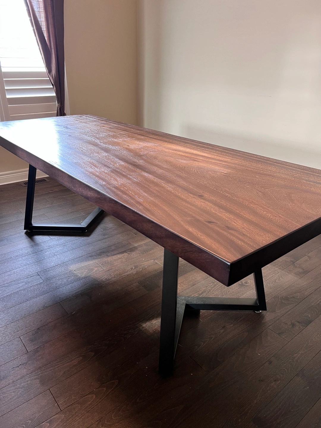 Stunning live edge dining table. Features a rich, dark wood top and a modern, minimalist black metal base. Perfect for a contemporary dining space. Unique natural hardwood table (South American walnut) Heavy and sturdy for life! Made out of ONE piece of nature! Not glued splines. Length 91” Width 34.6” Thickness 2.7” Can be delivered for additional cost.