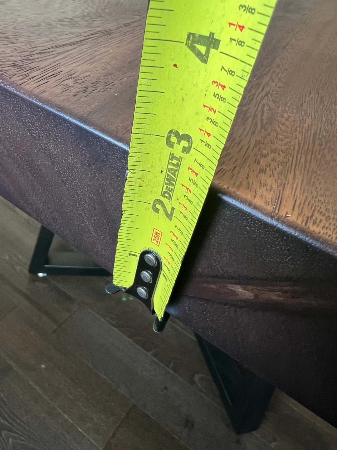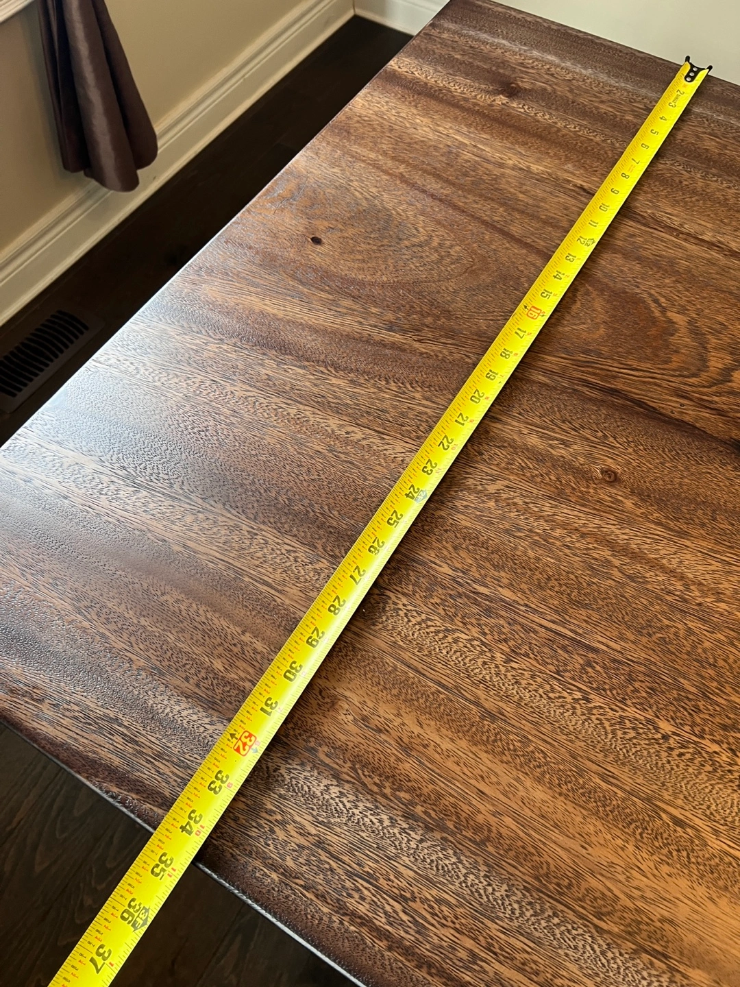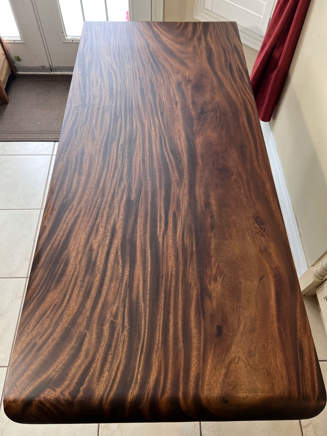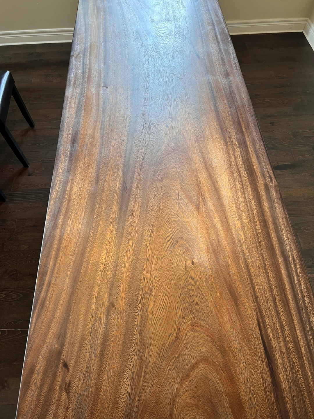 Stunning live edge dining table. Features a rich, dark wood top and a modern, minimalist black metal base. Perfect for a contemporary dining space. Unique natural hardwood table (South American walnut) Heavy and sturdy for life! Made out of ONE piece of nature! Not glued splines. Length 91” Width 34.6” Thickness 2.7” Can be delivered for additional cost.