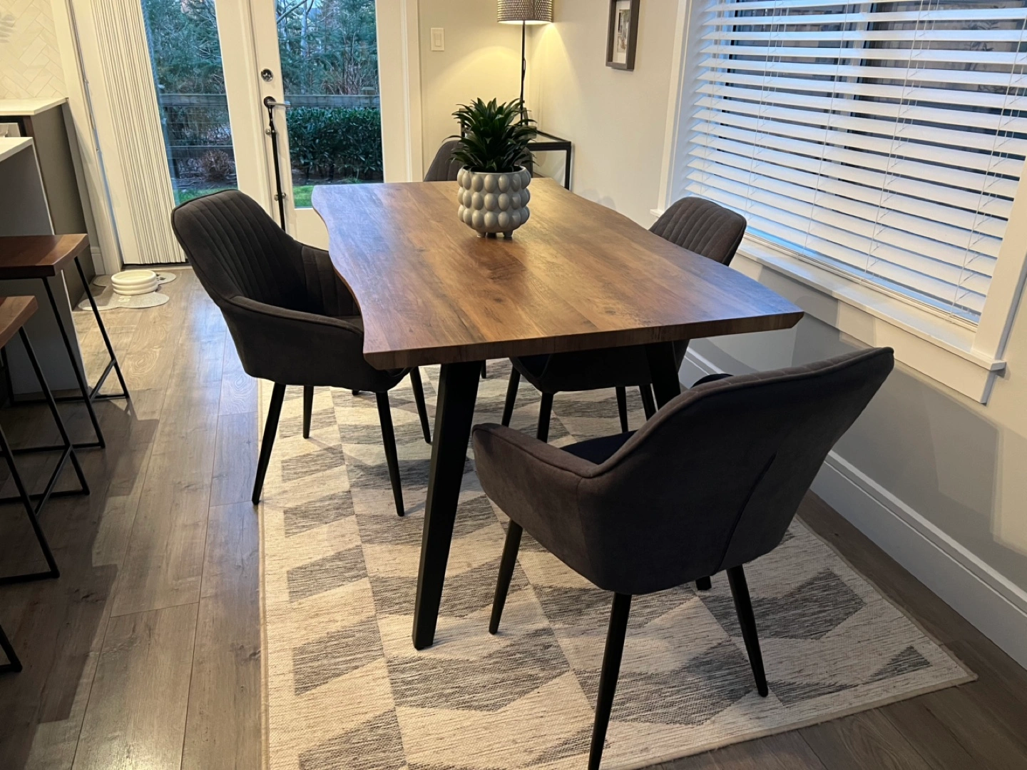 Beautiful live edge dining table. Four dark grey velvet chairs included. Black metal legs. Tabletop features a natural wood grain.