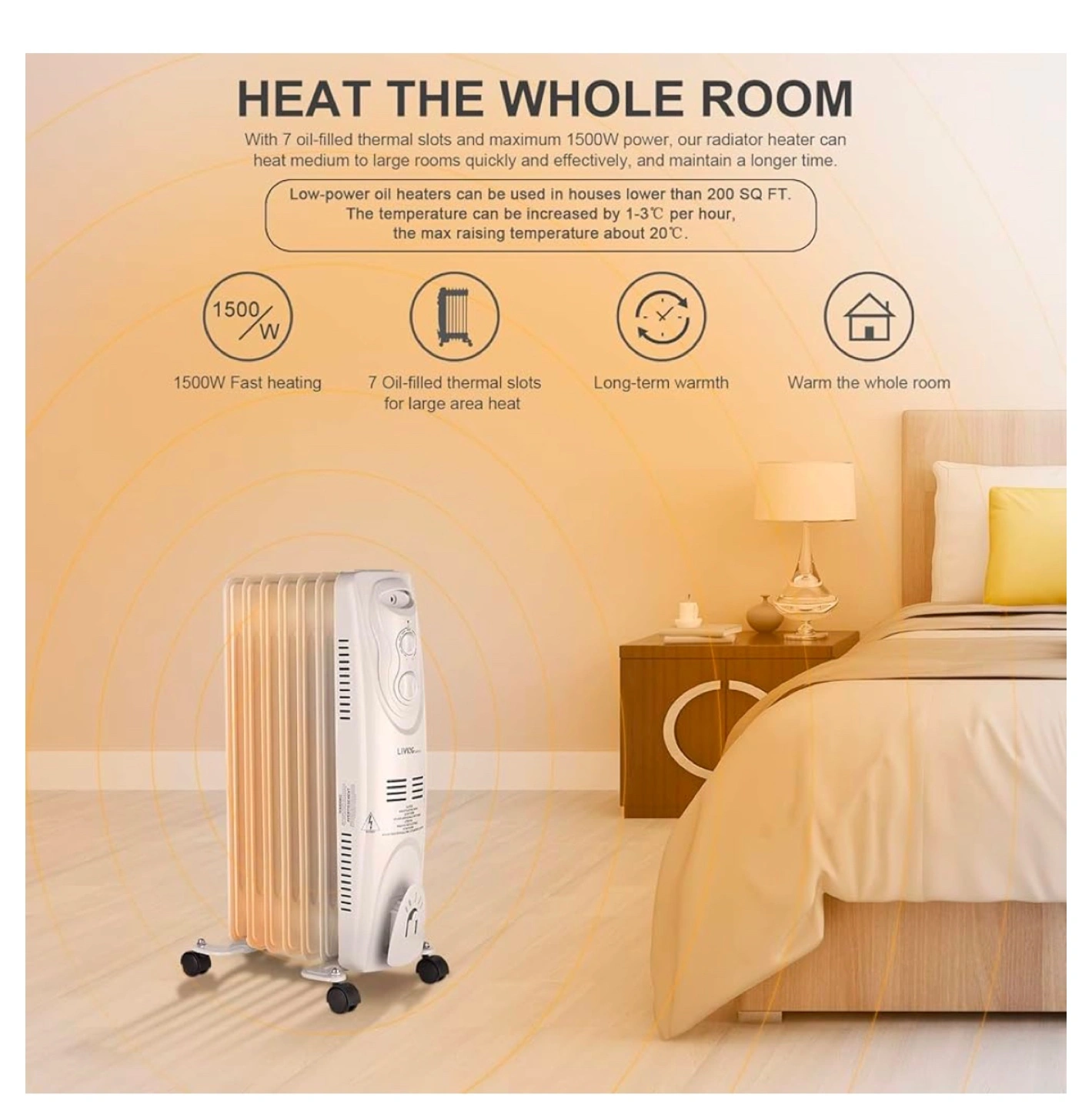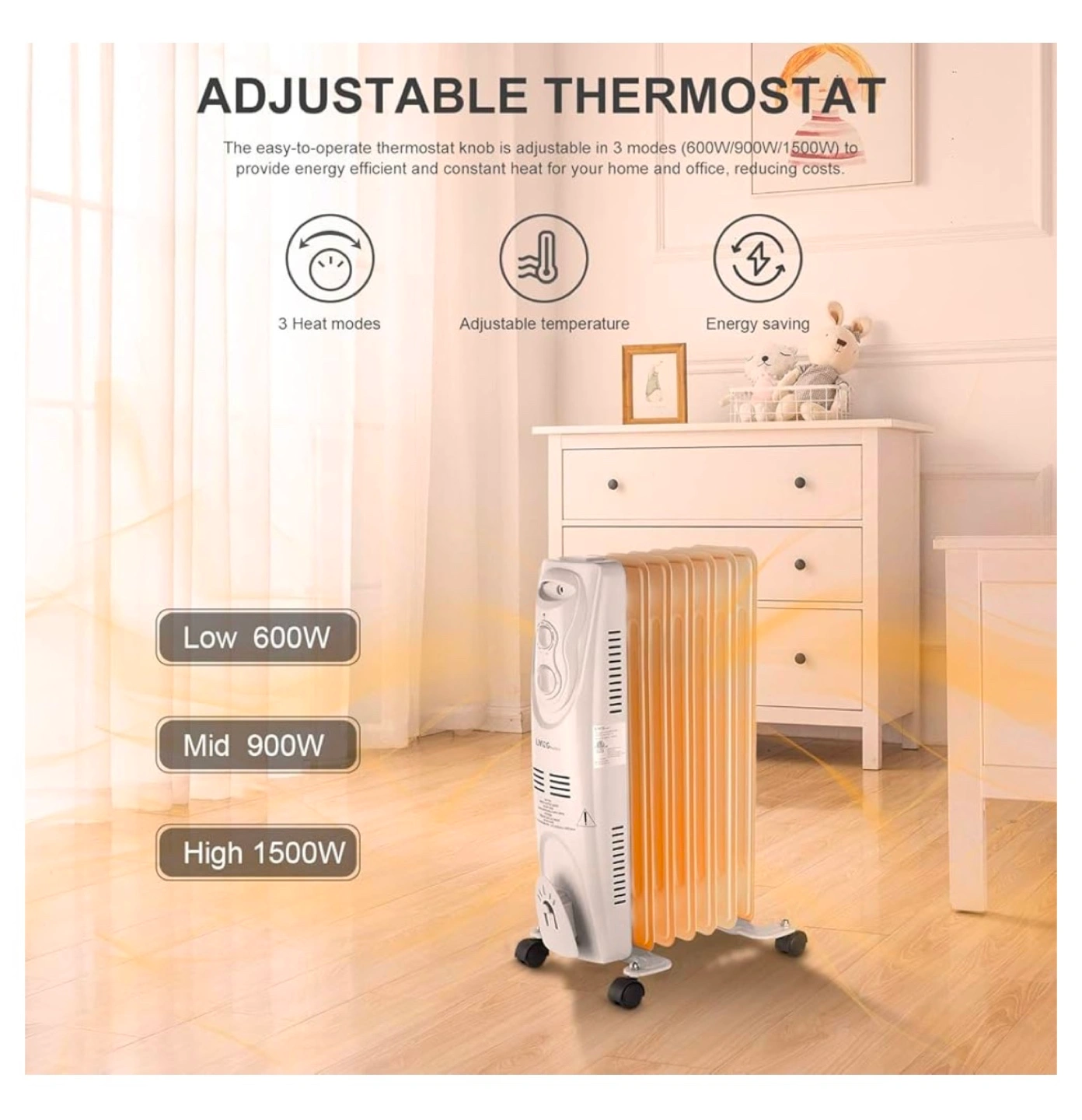 Oil filled radiator heater with 7 oil filled thermal slots. Adjustable thermostat with three heat modes: low (600W), mid (900W), and high (1500W). Includes wheels for easy movement. https://a.co/d/cAmNH0H