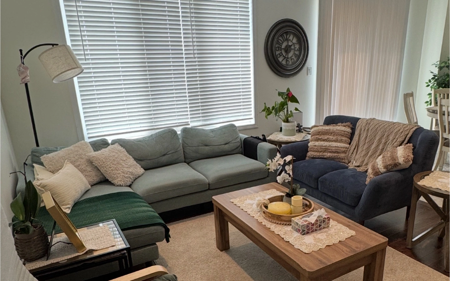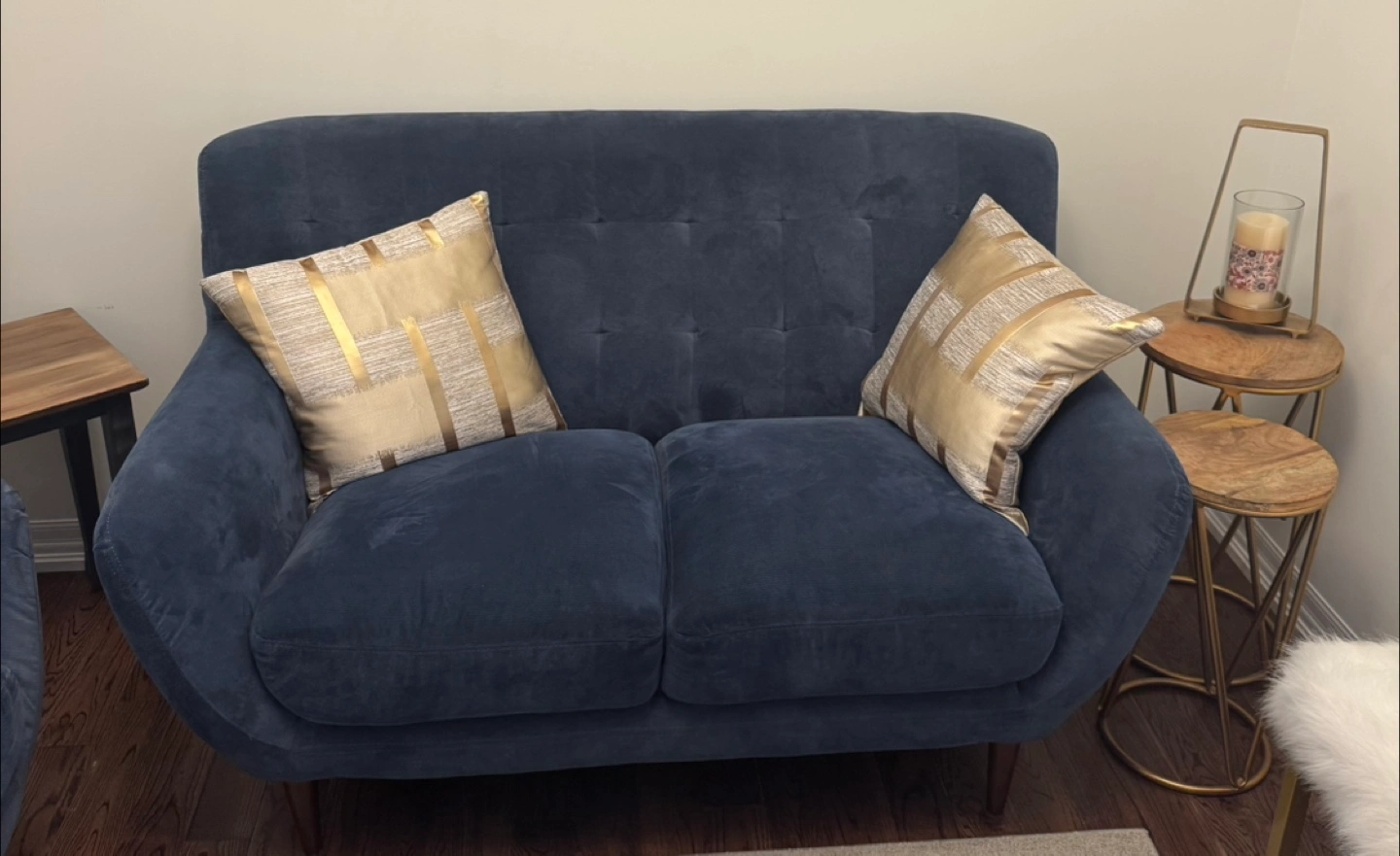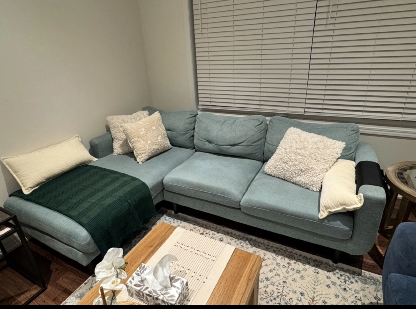 Selling a set of living room furniture. Includes a sectional sofa in a light green colour, a navy blue loveseat, and a dark brown media console. All pieces are in good condition and would be a great addition to any home