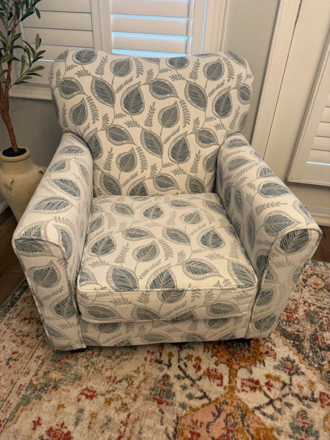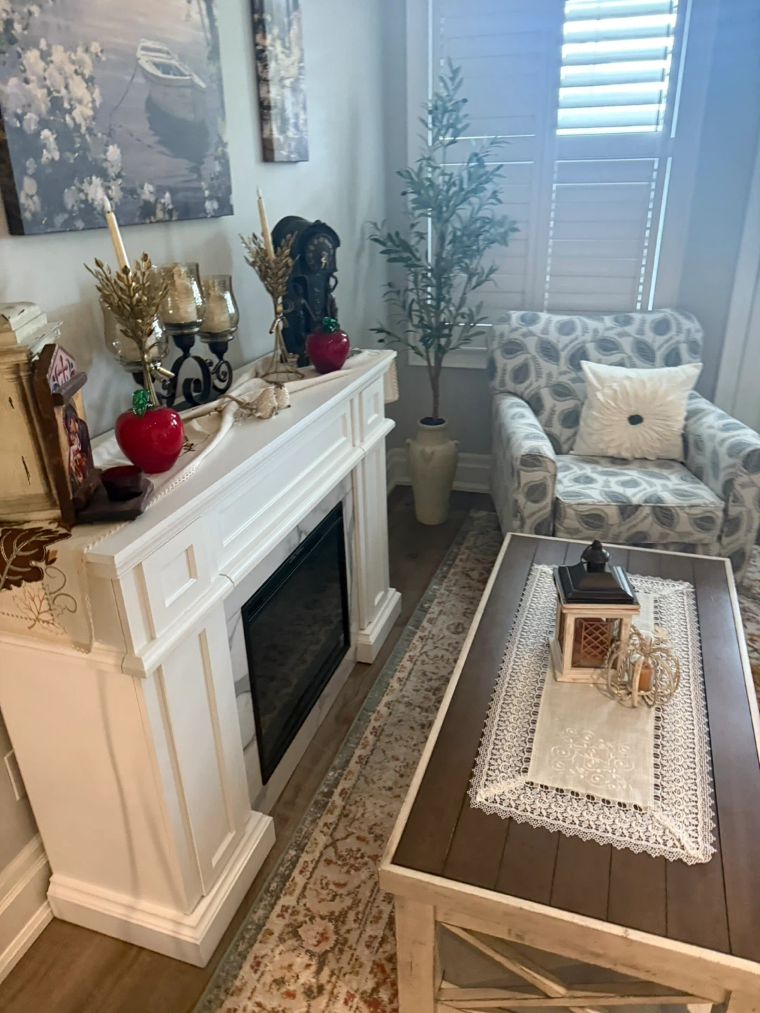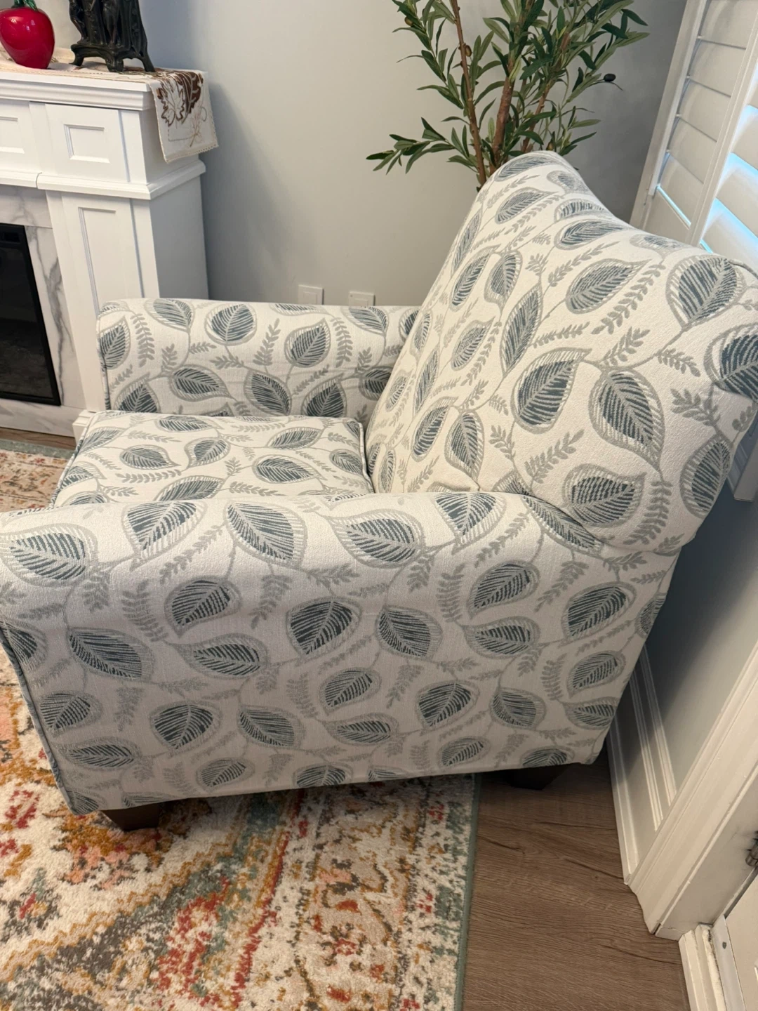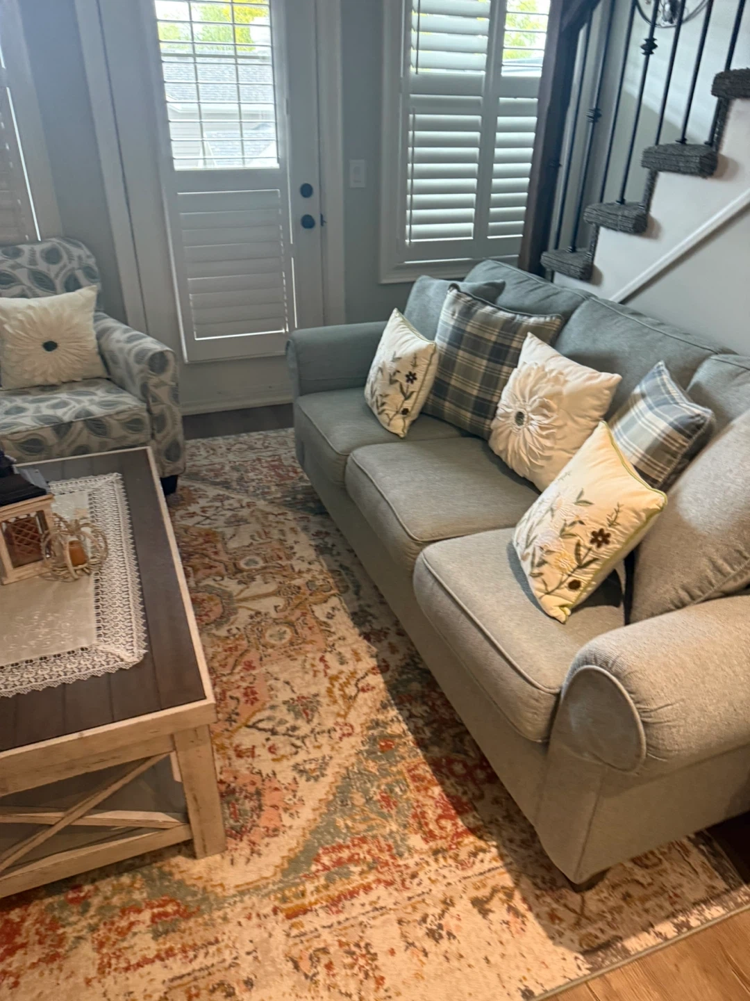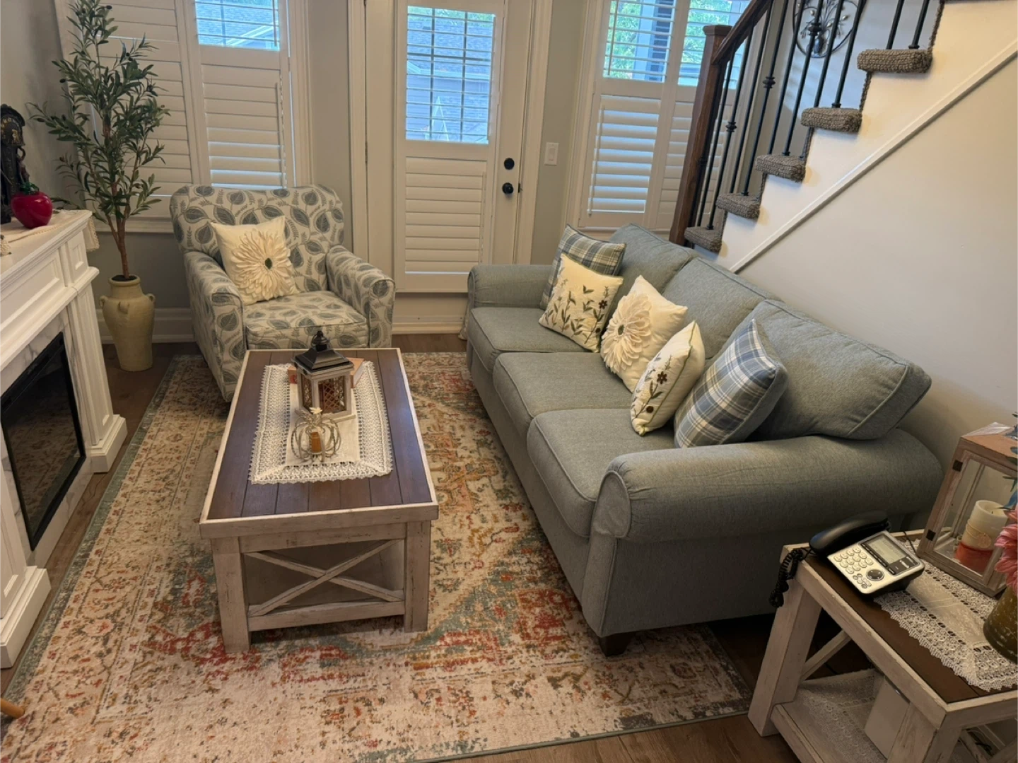 44Selling a living room set - couch, arm chair, fireplace, coffee table and accent table!! All in like new/ new condition. Couches originallly from Brick, coffee table and side table pier one. Looking for a new home !! Farmhouse/ Cozy design.